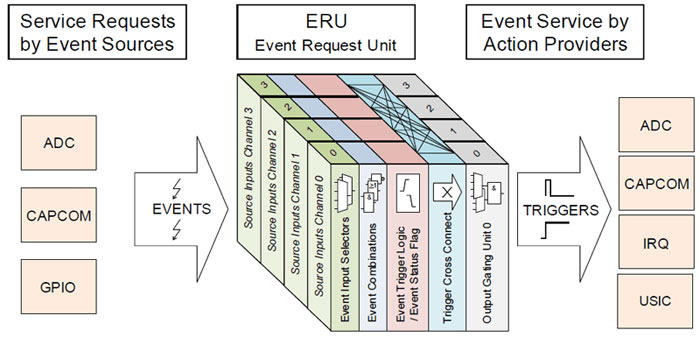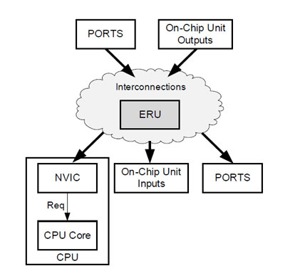 Jednym z udoskonalonych w nich elementów jest interfejs kontrolera przerwań NVIC, który nosi nazwę ERU od Event Request Unit. Jest to konfigurowalny blok pośredniczący pomiędzy źródłami przerwań i kontrolerem NVIC oraz blokami peryferyjnymi, które są przystosowane np. do wyzwalania za pomocą sygnałów pochodzących z systemu obsługi przerwań (rysunek 2).