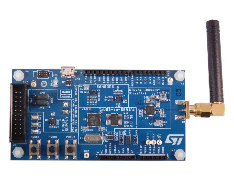 Zestaw ewaluacyjny BlueNRG-2 (STEVAL-IDB008V1 – na zdjęciu poniżej) zawiera czujniki MEMS, diody LED, przyciski i interfejs programatora, pozwalając natychmiast uruchomić dostarczone oprogramowanie demonstracyjne. Na płytce znajduje się również złącze kompatybilne z Arduino, co umożliwia tworzenie bardziej złożonych projektów poprzez dołączenie dodatkowych płytek rozszerzeń.