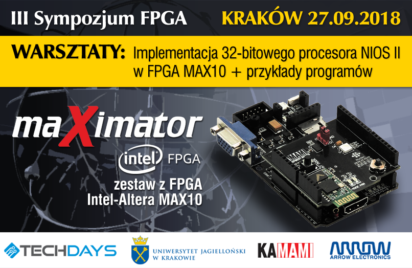 W dniach 27 i 28.09.2018 na Uniwersytecie Jagiellońskim w Krakowie odbędzie się III Sympozjum FPGA (współorganizowane przez KAMAMI.pl), w ramach którego odbędą się dwa szkolenia (warsztaty) dla praktyków zainteresowanych aplikowaniem układów FPGA: