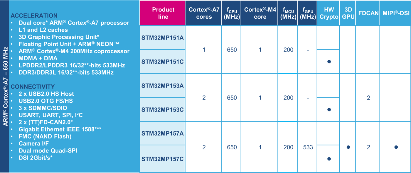 Nowa rodzina składa się na pierwszym etapie wdrożenia ze stosunkowo niewielkiej liczby modeli mikroprocesorów STM32MP1. Zestawienie ich najważniejszego wyposażenia pokazano w tabeli 1. Charakteryzują się są one przemyślaną budową i bogatym wyposażeniem: do dyspozycji mamy warianty mikroprocesorów z 1 lub 2 CPU (Cortex-A7, taktowanie do 650 MHz) oraz opcjonalnym koprocesorem graficznym GPU (zgodny z OpenGL ES 2.0).