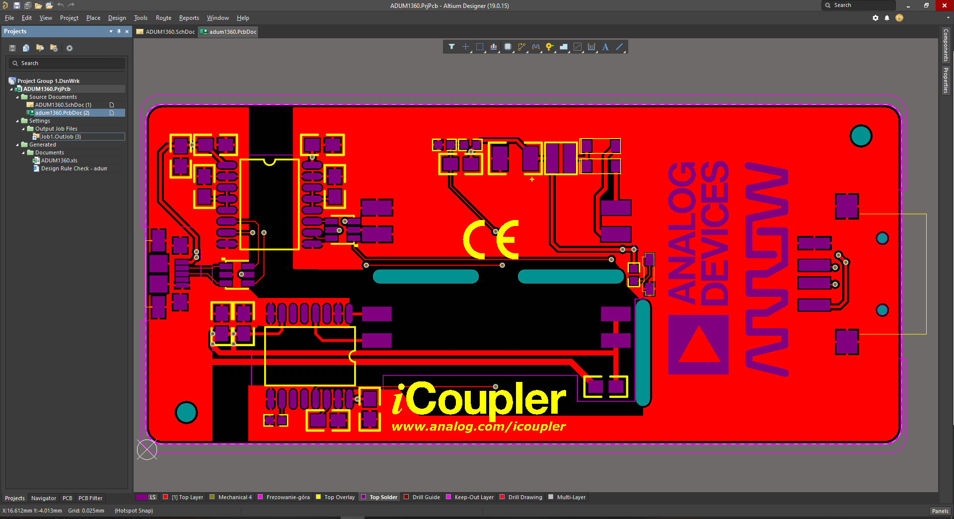 Projekt płytki drukowanej separatora USB oraz osłon izolacyjnych z nieprzewodzącego tworzywa wykonano w Altium Designerze (rysunek poniżej). Pliki produkcyjne (Gerber, NC Drill oraz BOM) są dostępne do pobrania na dole strony.