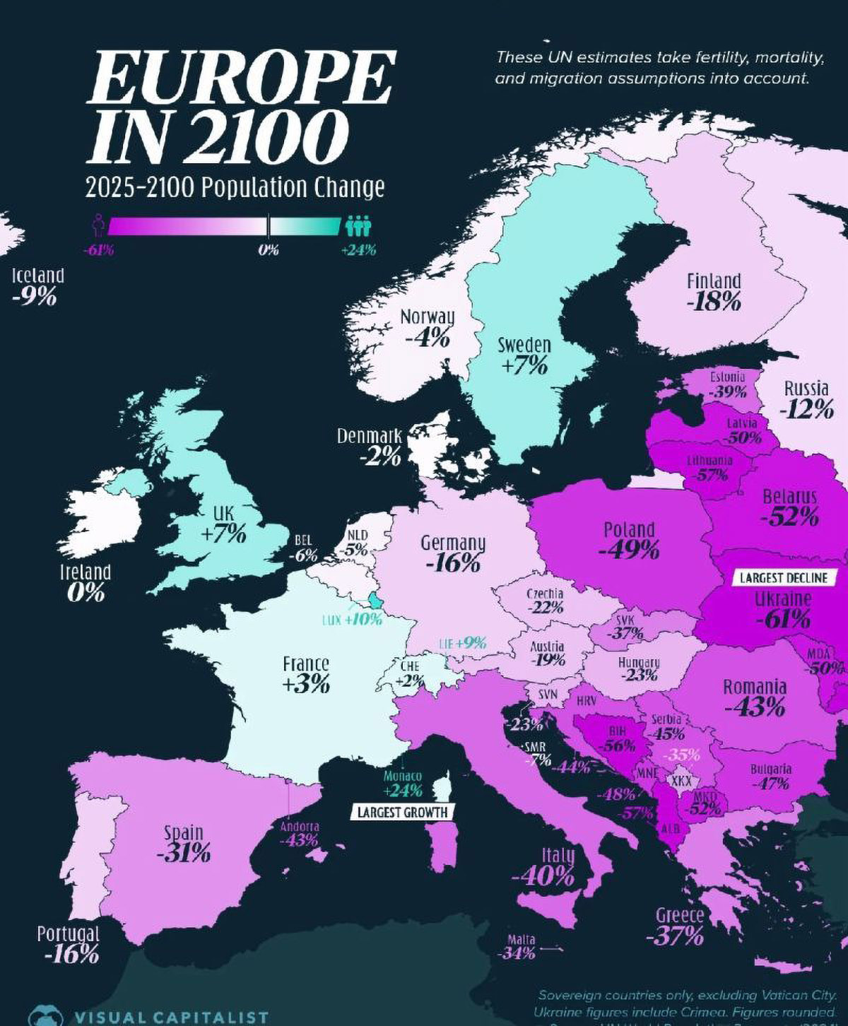 Zmiana populacji w Europie do roku 2100 wg. danych Organizacji Narodów Zjednoczonych