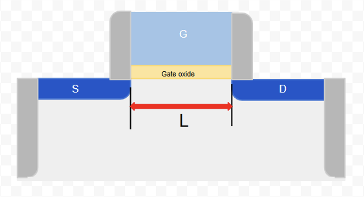 Struktura tranzystora planarnego MOSFET, L – długość kanału tranzystora