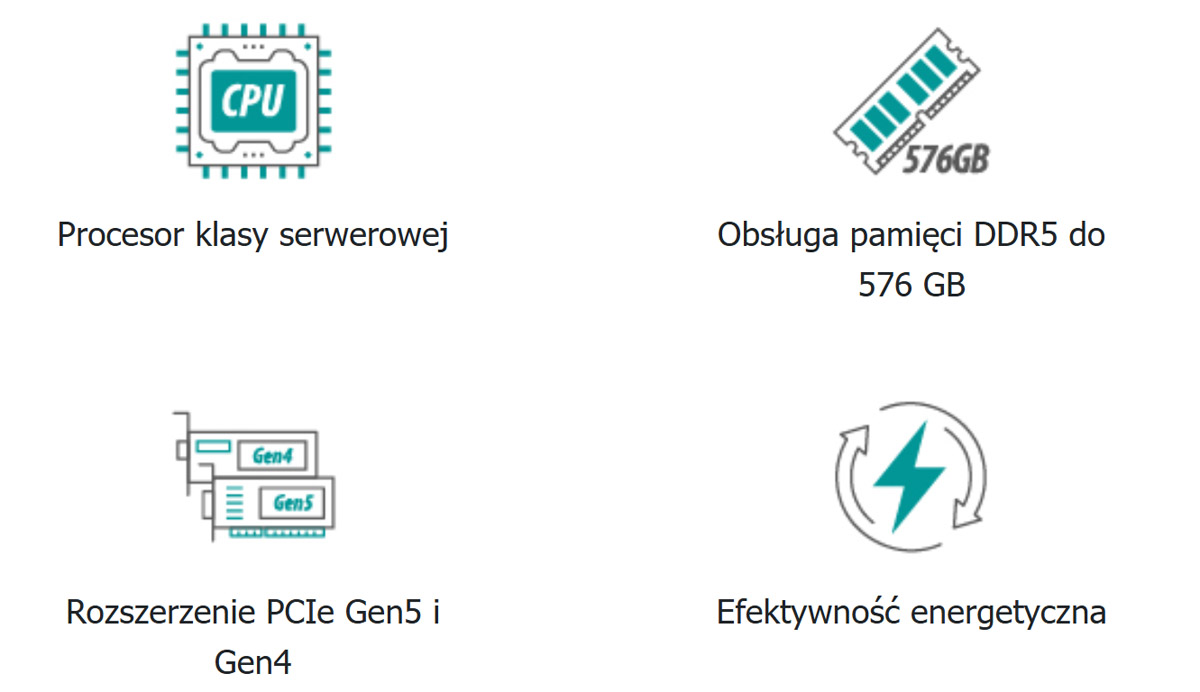 Wyposażona zarówno w gniazda PCIe Gen5, jak i Gen4, zapewnia wyjątkową skalowalność w celu rozbudowy infrastruktury, a wiele gniazd M.2 M-key umożliwia korzystanie z wielu przydatnych opcji używania pamięci masowej do wydajnej obsługi dużych zbiorów danych.