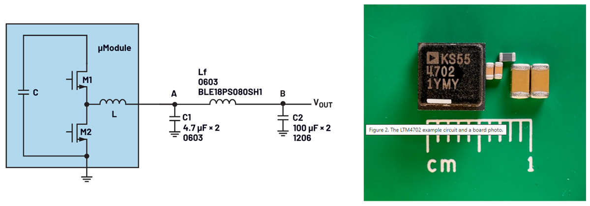 Na rys. 2 został przedstawiony przykładowy projekt modułu LTM4702. Charakteryzuje się on bardzo niską emisją zakłóceń elektromagnetycznych (EMI) i bardzo niskim szumem skutecznym. Częstotliwość przełączania można regulować w zakresie od 300 kHz do 3 MHz. W przykładzie projektowym jest ona ustawiona na 2 MHz, aby zoptymalizować szumy dla aplikacji 12 VIN do 1 VOUT. Zgodnie z proponowaną metodą projektowania filtrów LC, częstotliwość rezonansowa LC drugiego rzędu jest ustawiona na 400 kHz do 500 kHz, czyli 4 do 5 razy mniej niż częstotliwość przełączania.