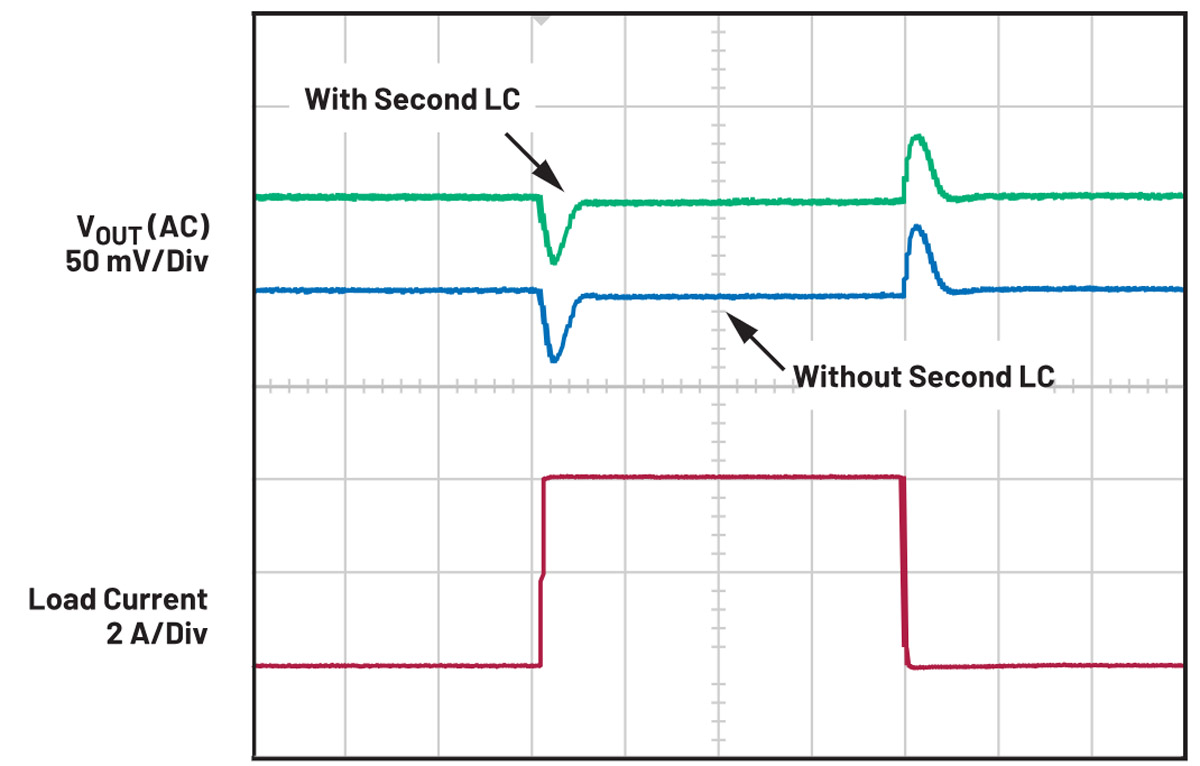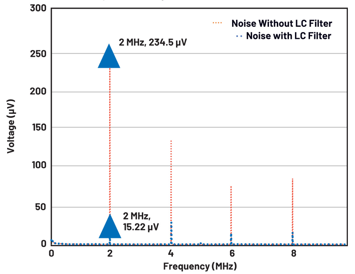 Obsługa aplikacji wysokoprądowych przy minimalnym poziomie szumów przy jednoczesnym zapewnieniu wysokiej wydajności i stabilności może stanowić wyzwanie. Dodanie filtra LC drugiego rzędu może znacznie zmniejszyć szumy, ale może spowodować niestabilność, jeśli nie zostanie on prawidłowo zoptymalizowany. Aby zminimalizować szumy bez pogarszania stabilności, należy użyć zoptymalizowanego filtra LC drugiego rzędu. Starannie dobierając wymagane komponenty L i C w oparciu o częstotliwość przełączania, szerokość pasma pętli sterowania i częstotliwość rezonansową, można zminimalizować szum przełączania przy jednoczesnym zachowaniu szybkiej odpowiedzi przejściowej i wysokiej szerokości pasma.