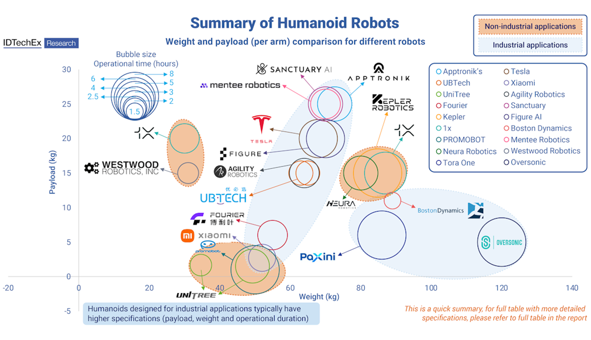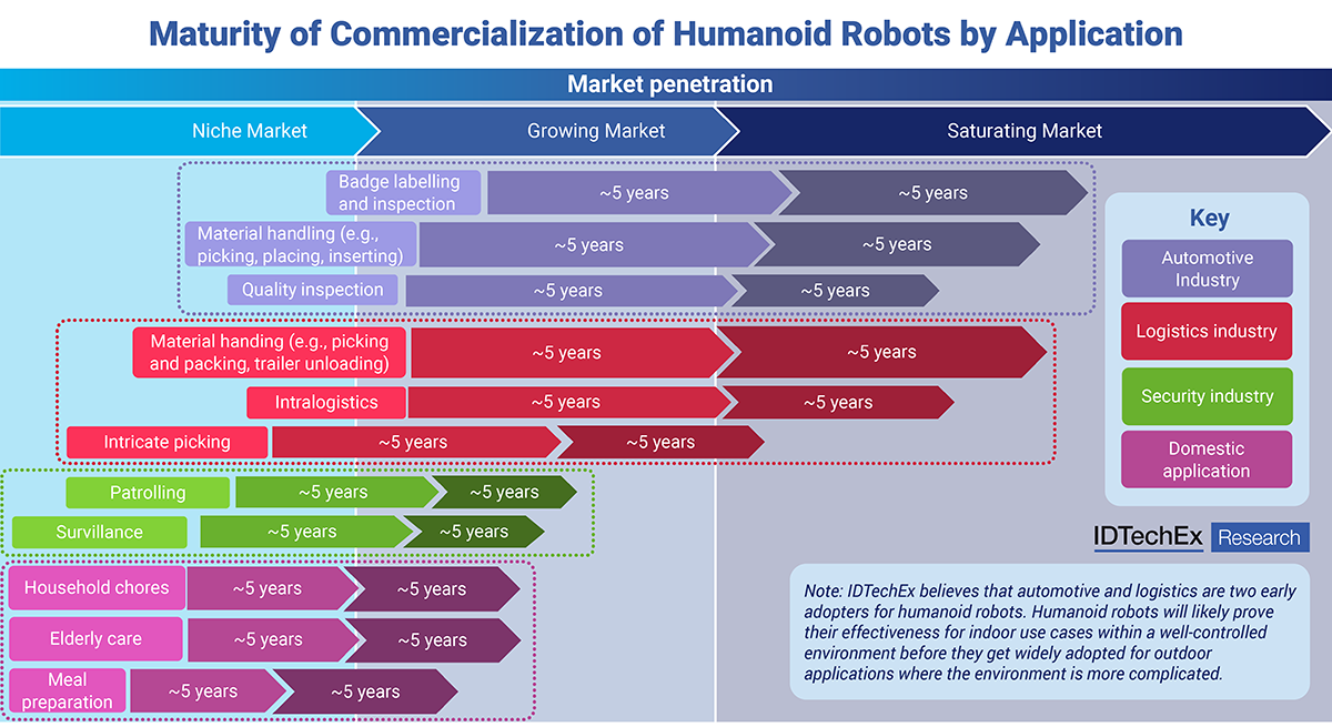 Obecnie przypadki użycia w fabrykach ograniczają się do zadań takich jak obsługa materiałów, etykietowanie identyfikatorów i inspekcja. Wciąż istnieją jednak wyzwania techniczne, w szczególności ograniczona żywotność baterii (skutkująca ponad 50% przestojami), niewielka ładowność i wysokie koszty (z cenami często przekraczającymi 100 000 USD za sztukę), chociaż IDTechEx prognozuje stały spadek kosztów, ostatecznie 20 000 USD za sztukę.