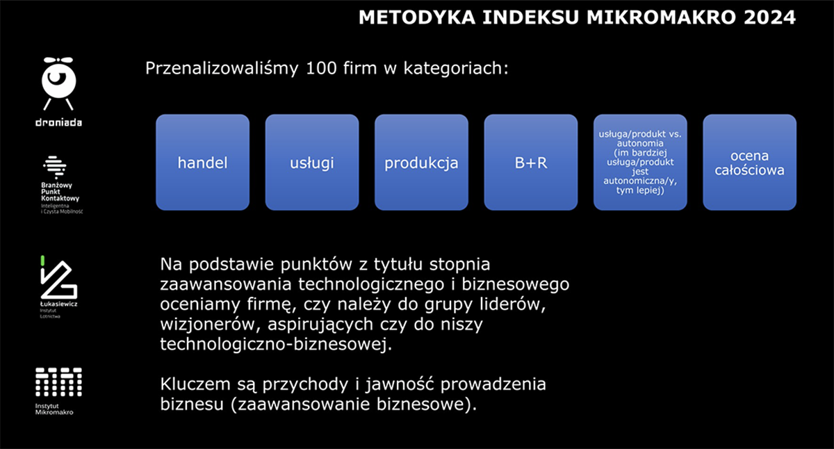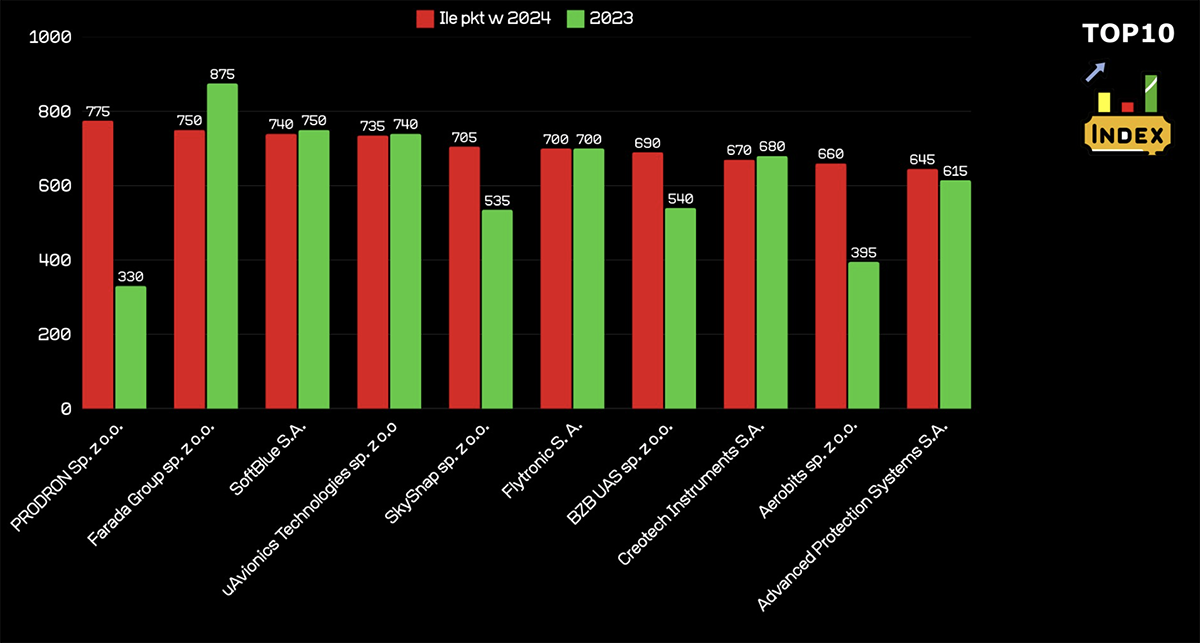Według Indeksu Mikromakro liderami rynku pod względem handlu są firmy TPI, Navigate i Dilectro. W usługach dominują: SoftBlue S.A., SkySnap sp. z o.o., BZB UAS sp. z o.o., Akademia UAV oraz VIMAP sp. z o.o. W produkcji najlepsze wyniki mają: PRODRON, Farada Group sp. z o.o., SoftBlue, uAvionics Technologies sp. z o.o., Flytronic, Aerobits sp. z o.o., Advanced Protection Systems, EUROTECH sp. z o.o., Under Ant i BZB UAS. Natomiast w zakresie B+R firmy Flytronic, Aerobits sp. z o.o. i Advanced Protection Systems. Pod względem autonomii przodują PRODRON, Farada Group, uAvionics Technologies, SkySnap, Flytronic, BZB UAS, Aerobits, Under Ant i Astranate sp. z o.o.