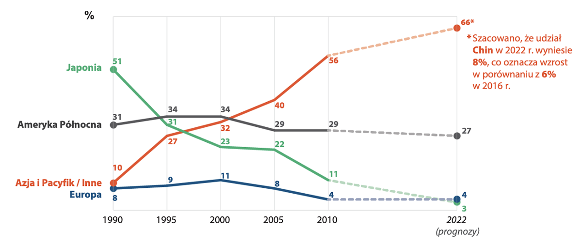 Dynamika zmian udziału w wydatkach kapitałowych związanych z półprzewodnikami w podziale na miejsce siedziby przedsiębiorstwa (lata 1990–2022). Źródło: TechInsight