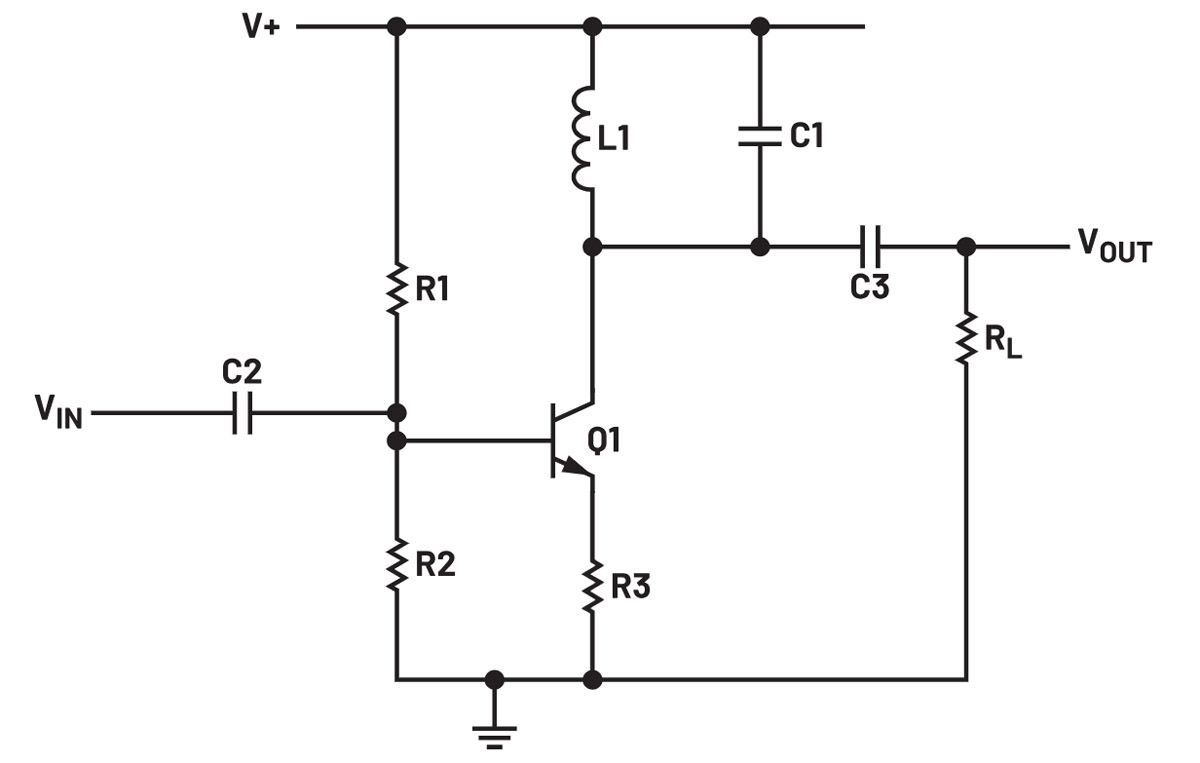 Wymagania systemów komunikacyjnych dotyczące obsługiwanego pasma często przekraczają ograniczenia wzmacniaczy operacyjnych. W takich przypadkach często stosuje się dyskretne wzmacniacze strojone. Częstotliwość pracy jest zwykle ustawiana obwodem rezonansowym LC (cewka-kondensator połączone równolegle) umieszczanym w kolektorze (lub drenie), zamiast rezystora. Jeden z takich obwodów pokazano na rys. 1.