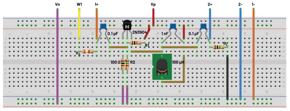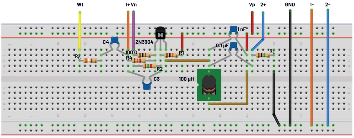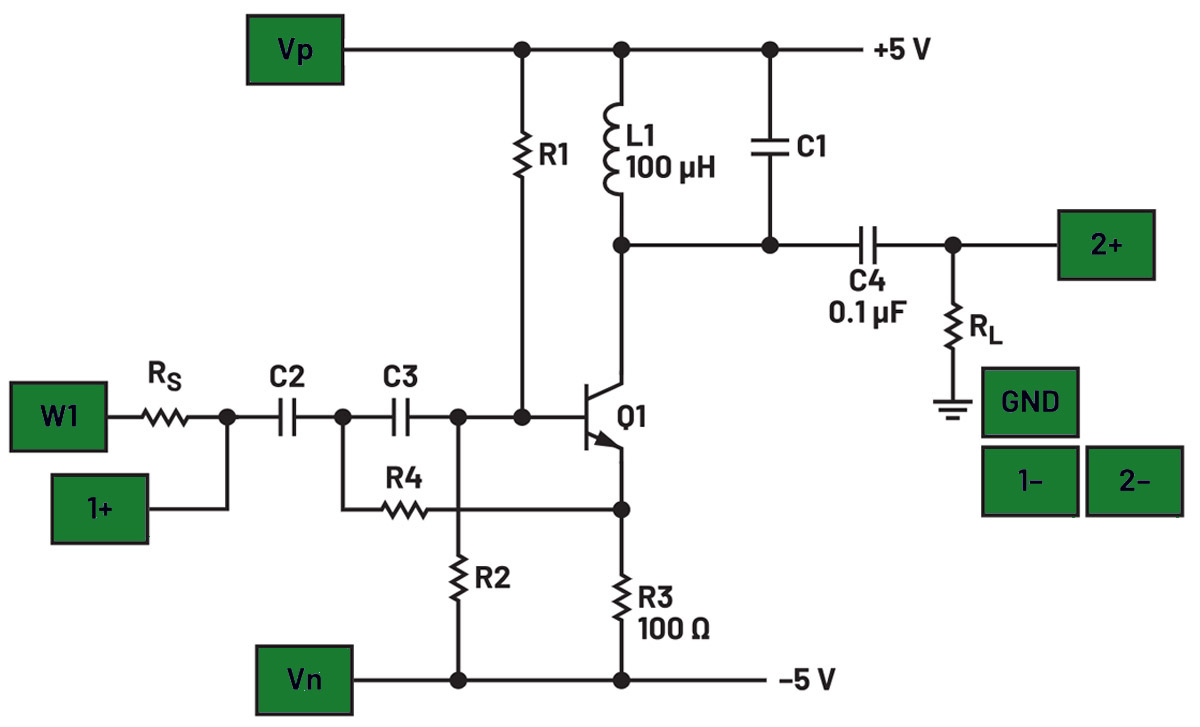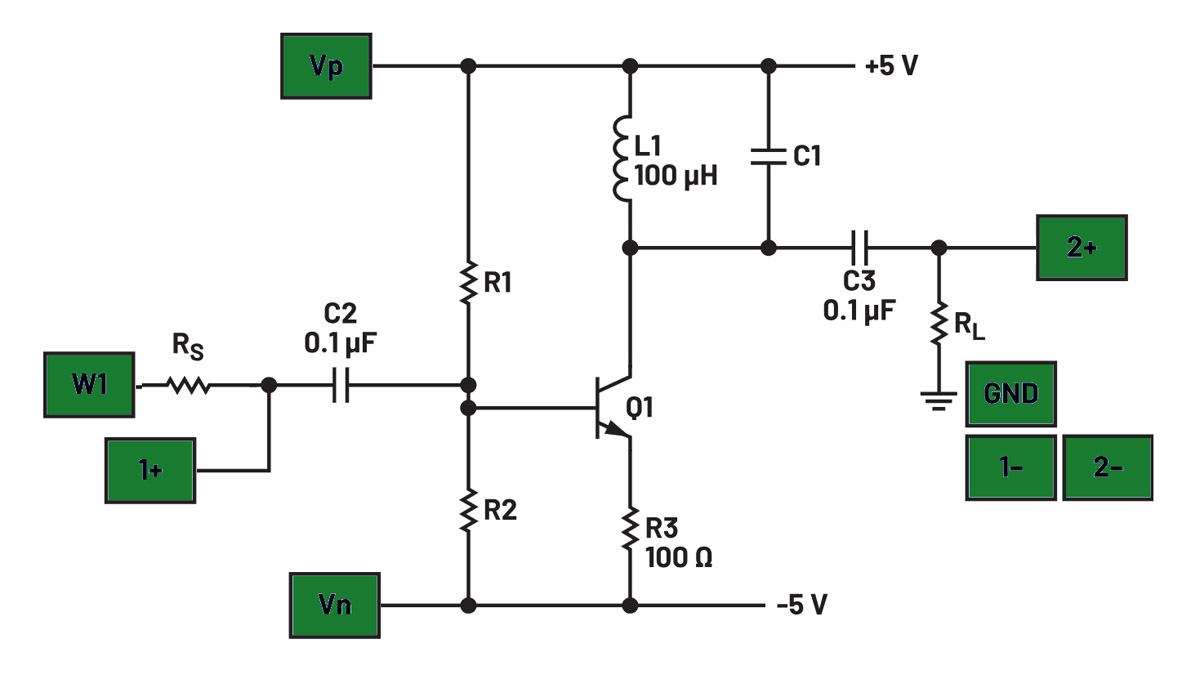 Zbuduj układ pokazany na rys. 2 na płytce prototypowej. Na podstawie symulacji przeprowadzonych przed pomiarami wybierz wartości rezystorów polaryzujących R1 i R2 tak, aby przy rezystorze emiterowym R3 100 Ω, prąd kolektora w tranzystorze NPN Q1 wynosił od 5 mA do 10 mA. Załóżmy, że obwód jest zasilany napięciami +5 V i -5 V dostępnymi w zestawie ADALM (łącznie 10 V). Upewnij się, że suma R1 i R2 (całkowita rezystancja) jest tak wysoka, jak to możliwe, aby utrzymać jak największą impedancję wejściową stopnia wzmacniacza. Ponownie, w oparciu o symulacje, oblicz wartość C1 tak, aby częstotliwość rezonansowa z cewką L1 o indukcyjności 100 μH była bliska 500 kHz. Wybierz pojemność kondensatora z typoszeregu. Możesz połączyć dwa kondensatory szeregowo lub równolegle, aby zbliżyć się jak najbardziej do obliczonej wartości. Oblicz nową częstotliwość rezonansową na podstawie ostatecznej pojemności C1. Możesz próbować uwzględnić wpływ pasożytniczej pojemności cewki, którą można określić mierząc rezonans własny cewki indukcyjnej.1
