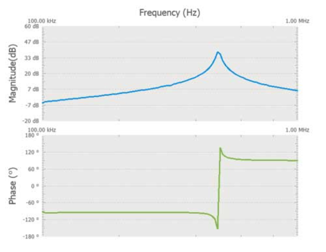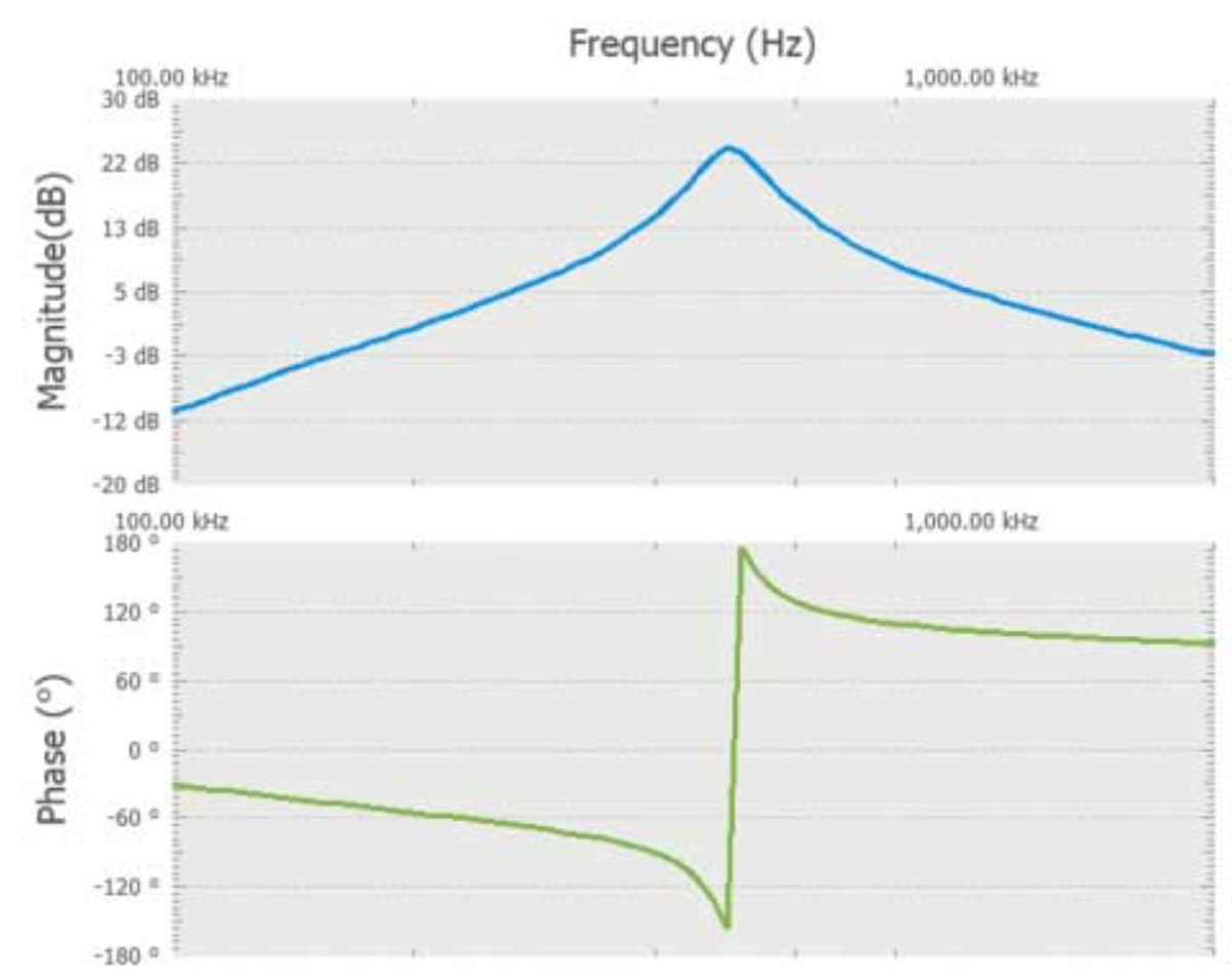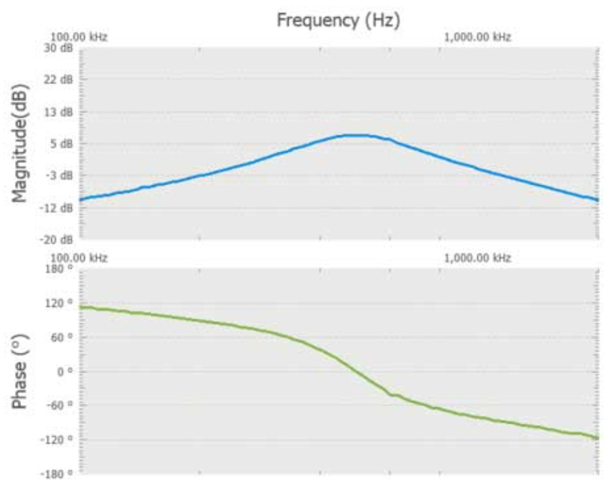 Uruchom pojedyncze przemiatanie częstotliwości. Powinieneś zobaczyć wykresy amplitudy i fazy w funkcji częstotliwości, które wyglądają bardzo podobnie do wyników symulacji. Po ustaleniu, że maksymalne wzmocnienie wzmacniacza występuje w pobliżu 500 kHz, można zmniejszyć zakres przemiatania częstotliwości, rozpoczynając od 100 kHz i kończąc na 1 MHz. Pamiętaj, aby wyeksportować wszystkie dane przemiatania częstotliwości do pliku .csv w celu dalszej analizy w programie Excel lub MATLAB®. Przykładowy wykres z programu Scopy przedstawiono na rys. 4.