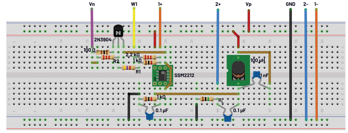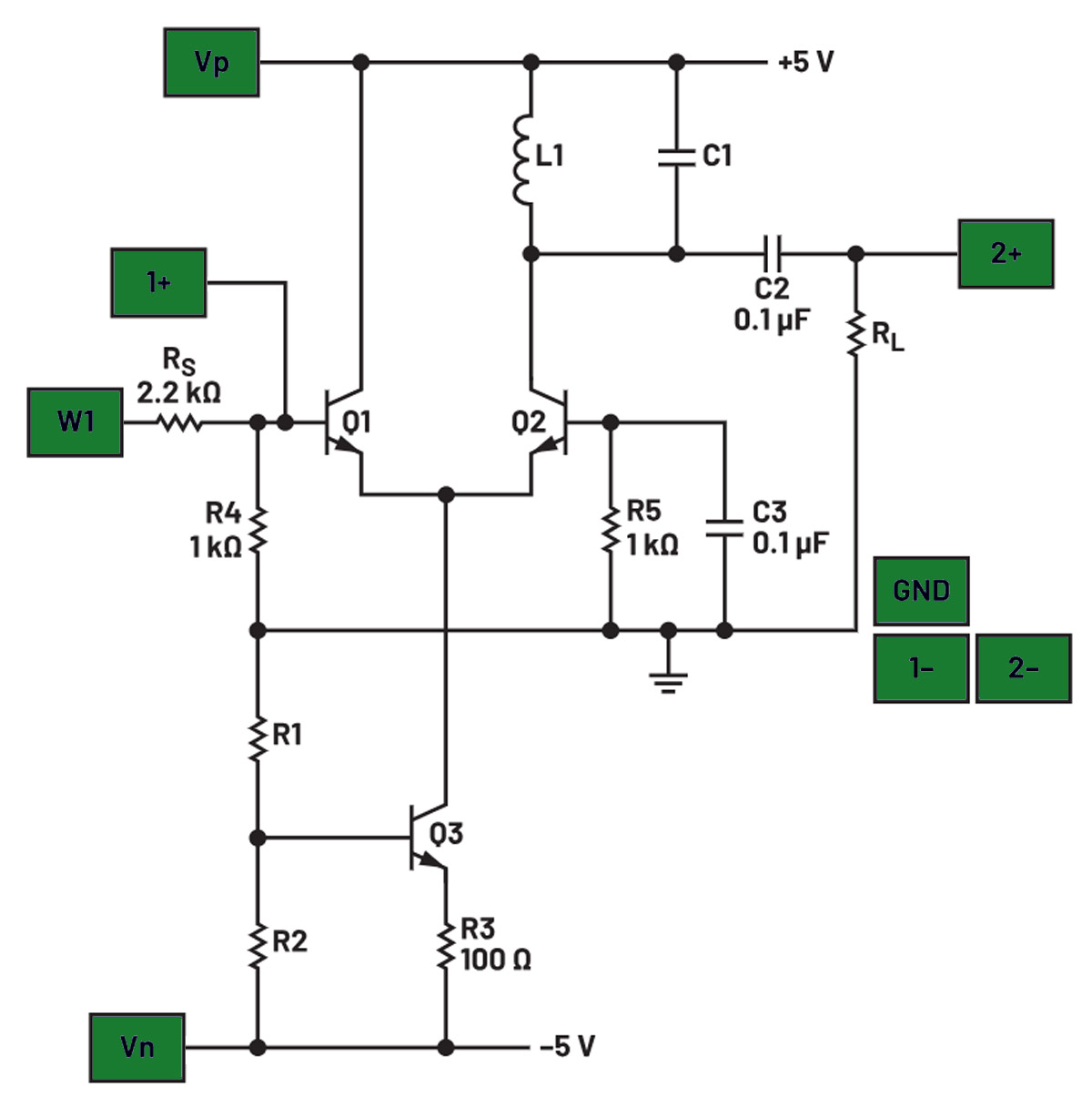 Zbuduj układ z rys. 6 na płytce prototypowej. Q1 i Q2 to fabrycznie sparowane tranzystory zawarte w układzie scalonym SSM2212. Wybierz wartości rezystorów polaryzujących R1 i R2 tak, aby prąd kolektora tranzystora Q3 był wynosił od 5 mA do 10 mA, przy założeniu, że rezystor emiterowy R3 ma rezystancję 100 Ω. W tym przypadku dzielnik rezystorowy R1, R2 jest zasilany napięciem między masą a zasilaniem -5 V. Użyj tej samej kombinacji L1 i C1 jak w poprzednim stopniu wzmacniacza.