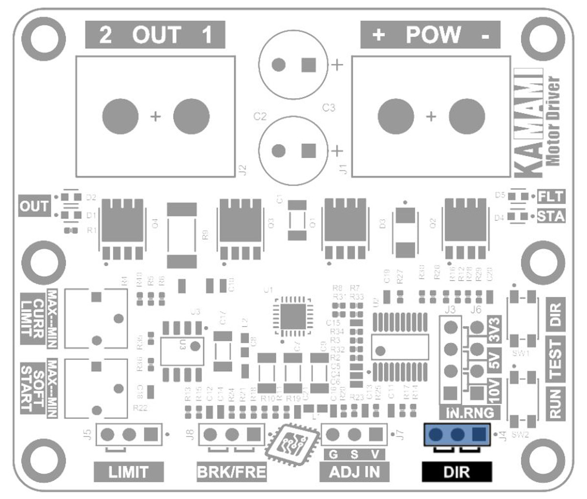 Płytka KAmod Motor Driver zawiera jeszcze kilka portów, które umożliwiają obsługę niektórych funkcji sterownika za pomocą zworek lub pinów cyfrowych GPIO. Jedno z nich, port DIR, pozwala wybrać polaryzację napięcia wyjściowego do silnika, a tym samym kierunek ruchu wirnika. Użytkownik, ustawiając pozycję zworki lub też poziom linii 2. portu DIR jest w stanie wybrać kierunek pracy silnika. Odwrócenie polaryzacji (na wyjściu OUT 1 będzie masa zasilania, a na wyjściu OUT 2 – potencjał dodatni) następuje przy ustawieniu zworki w pozycję zwierającą piny 2 i 3, lub zwarciu pinu 2 do masy. Pin 2 jest „podciągnięty” do napięcia 3,3 V, a więc złącze pozostawione wolne ustawi kierunek polaryzacji w pozycji klasycznej (na wyjściu OUT 1 będzie potencjał dodatni, a na wyjściu OUT 2 – masa zasilania).