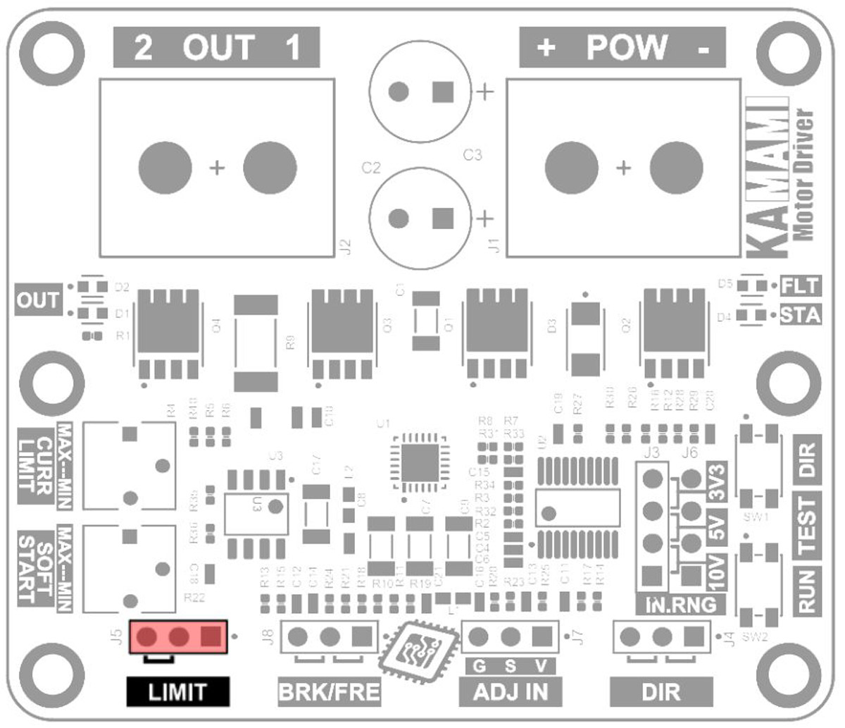 Za pomocą złącza LIMIT można wymusić zatrzymacie pracy silnika. Moc wyjściowa jest wtedy ustawiana na wartość 0% niezależnie od sygnału sterującego doprowadzonego na wejście ADJ IN. Aby wyłączyć silniki należy podać na środkowy pin napięcie masy lub zewrzeć z pinem 3 złącza. Pin jest normalnie „podciągnięty” do napięcia 3,3 V, a więc jeśli nie jest podłączony, nie wyłączy pracy silnika.