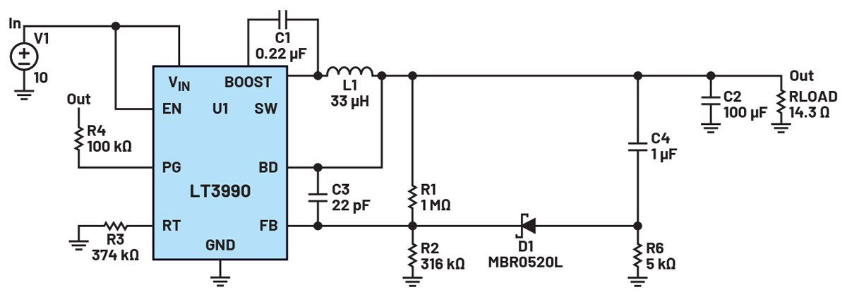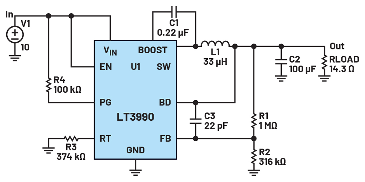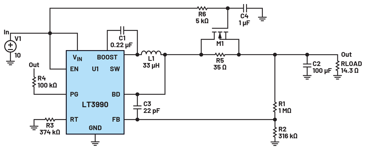 Gdy w układzie scalonym nie ma miękkiego startu, prąd, który układ ten będzie próbował dostarczyć do kondensatorów wyjściowych, jeśli nie są one naładowane, to prąd maksymalny lub wynikający z ograniczenia. Aby dodać funkcję miękkiego startu, do zapewnienia ochrony wymagane są dodatkowe elementy dyskretne, takie jak kombinacja RC umożliwiająca uzyskanie opóźnienia czasowego i opcjonalnie dioda lub tranzystor FET. Układ LT3990 to przetwornica obniżająca napięcie, która ma tranzystory FET 62 V/0,35 A, bardzo niski IQ (prąd spoczynkowy), kwalifikację AEC-Q100, szeroki zakres częstotliwości pracy i bardzo niskie tętnienia napięcia wyjściowego. Nie ma on jednak funkcji miękkiego startu. Dane katalogowe określają typowe ograniczenie prądu przełącznika na 0,7 A. Aby ocenić zachowanie układu LT3990 przed i po dodaniu dyskretnych elementów realizujących funkcję łagodnego startu, można użyć wbudowanego przykładowego układu LTspice (pokazanego na rysunku 14). Układ ten przekształca napięcie 10 V na 5 V/0,35 A. Symulując obwód, można zaobserwować, że bez funkcji miękkiego startu prąd cewki indukcyjnej osiąga typową wartość graniczną prądu podczas uruchamiania (rys. 15).