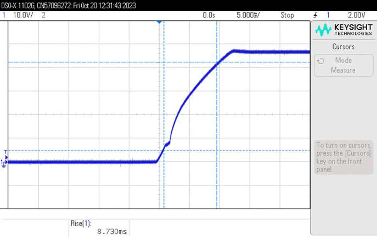 Czasami do zasilania wzmacniaczy RF preferowane jest najpierw podłączenie zasilania, a następnie podłączenie obciążenia. Takie podejście zapewnia, że zasilanie jest podnoszone, gdy prąd obciążenia jest bardzo mały lub nie ma go wcale. Pozwala to zmniejszyć prąd rozruchowy. Scenariusz ten przedstawiono na rysunku 11, a w rezultacie czas rozruchu skraca się do ~12 ms. Nawet w przypadku korzystania z obciążenia cyfrowego w trybie CC (stały prąd), w którym obciążenie jest ustawione na określoną wartość, np. 0,19 A lub 0,38 A, nadal można zaobserwować czas rozruchu wynoszący ~12 ms – podobnie jak bez podłączonego obciążenia. Tryb CC może oznaczać wysoką impedancję dla przetwornicy DC-DC, więc należy zachować ostrożność, aby dokładnie zmierzyć czas miękkiego startu we wszystkich możliwych scenariuszach.