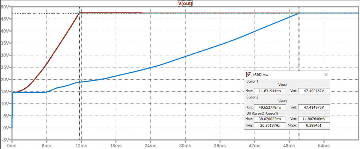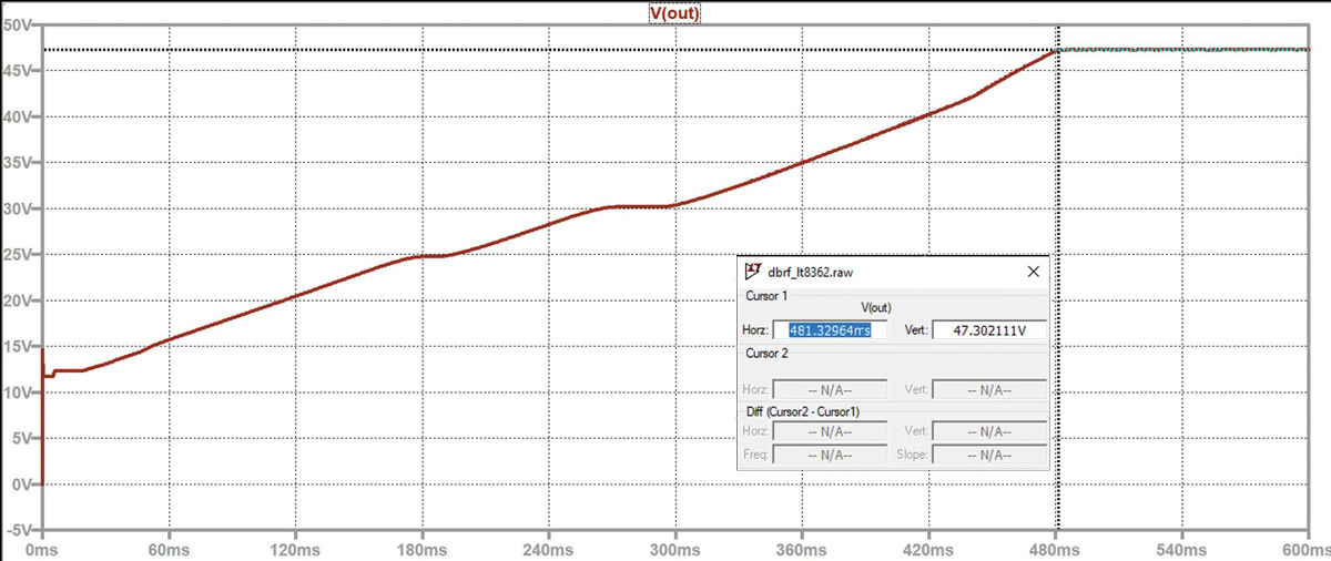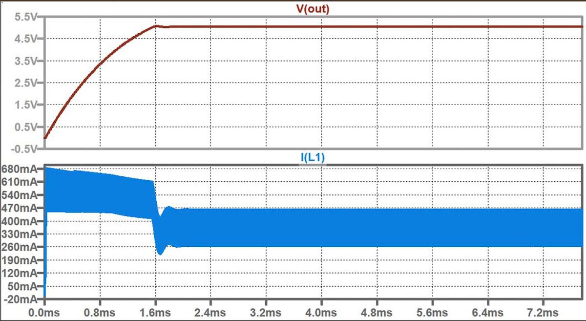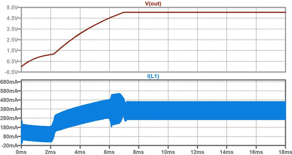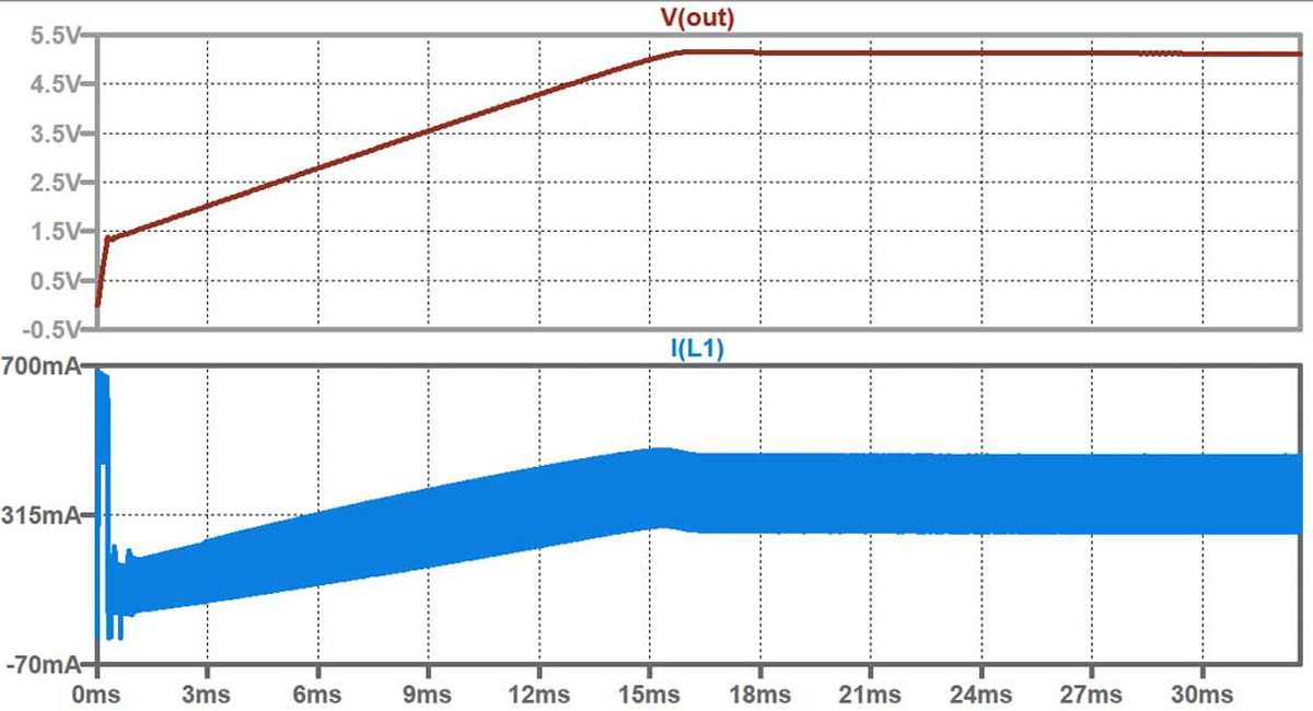 Gdy równanie miękkiego startu nie jest uwzględnione, użytecznym narzędziem do przewidywania zachowania układu może być LTspice®. Na rysunku 12 widzimy wynik symulacji LTspice pomiaru, którego wyniki zostały przedstawione na rysunku 10. Jest to czas rozruchu wynoszący ~500 ms. Symulacja bez obciążenia i z prądami 0,19 A, gdy zastosowano kondensator miękkiego startu 0,22 μF, również pokazuje prawidłowe wyniki ~12 ms i ~50 ms, (rys. 11 i 8). Wykorzystując symulacje LTspice, można przewidzieć zachowanie obwodu i oszacować czas miękkiego startu, nawet jeśli równanie miękkiego startu nie jest wyraźnie podane. Może to być cenne narzędzie do zrozumienia i optymalizacji wydajności układu.