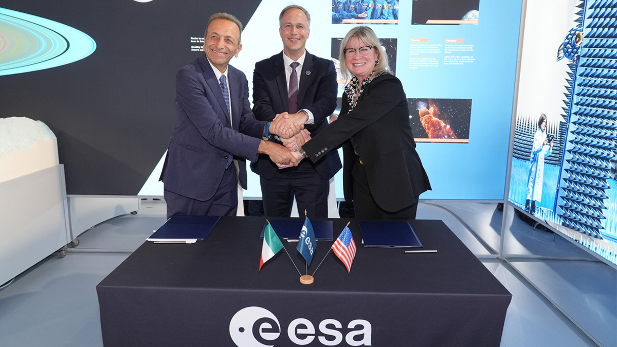 Giampiero Di Paolo z Thales Alenia Space, Daniel Neuenschwander z ESA i Pat Remias z Blue Origin. Źródło: ESA©