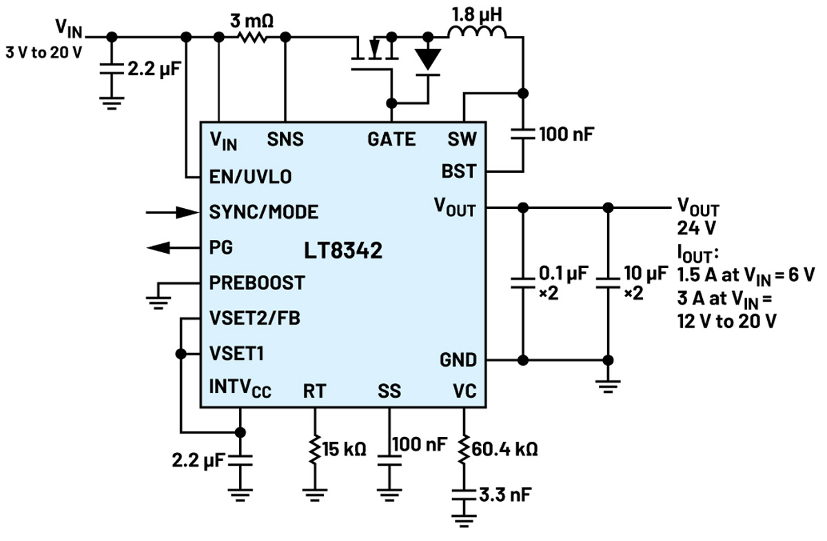 Układ scalony LT8342 integruje przełączniki mocy 40 V, 9 A z programowalnym napięciem wyjściowym do 36 V. Obsługuje również szeroki zakres napięcia wejściowego od 2,8 V do 40 V i ma tryb pracy PassThru™ stosowany w warunkach, gdy VIN≥VOUT. Układ LT8342 charakteryzuje się niskim prądem spoczynkowym pinów VIN w trybie Burst Mode® i może być programowany, a także synchronizowany przebiegiem o częstotliwości do 3 MHz. Pozwala to zmniejszyć rozmiar elementów zewnętrznych i rozmiar cewki indukcyjnej. W układzie została zastosowana architektura Silent Switcher®, dzięki której zminimalizowano emisję zakłóceń elektromagnetycznych przy jednoczesnym zapewnieniu wysokiej sprawności. Jest on dostępny w kompaktowej obudowie LQFN o wymiarach 4 mm × 4 mm.
