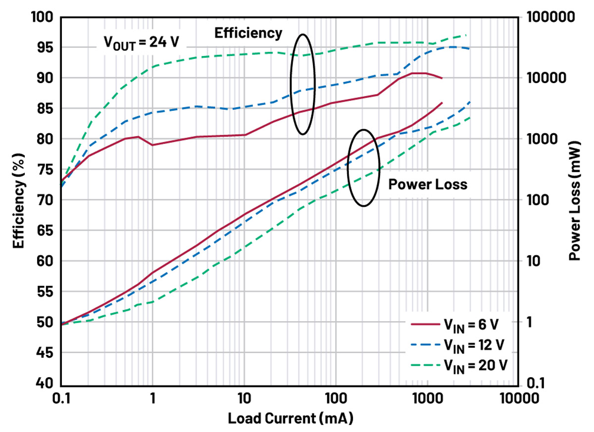 Poprzez konfigurację pinu SYNC/MODE przetwornica podwyższająca napięcie może, w zależności od potrzeb aplikacji, pracować w trybie Burst lub w trybie pomijania impulsów (pulse-skipping). Tryb Burst zapewnia wyższą sprawność w warunkach małego obciążenia, natomiast tryb pomijania impulsów zmniejsza tętnienia wyjściowe. Na rys. 2 przedstawiono sprawność aplikacji 24 V działającej w trybie Burst, gdy SYNC/MODE = 0 V. Sprawność pozostaje powyżej 70% w warunkach niewielkiego obciążenia i może osiągnąć wartość szczytową ponad 95% przy 3 A, gdy napięcie wejściowe wynosi 20 V.