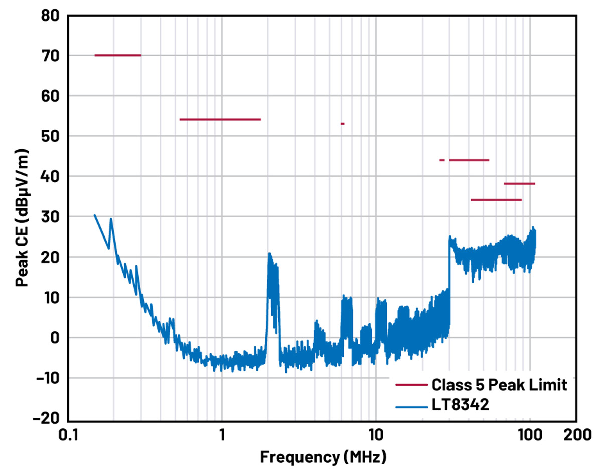 W układzie LT8342 został zaimplementowany opcjonalny tryb modulacji częstotliwości z rozpraszaniem widma (SSFM) oraz architekturę Silent Switcher. Cechy te zapewniają dodatkową minimalizację emisji zakłóceń elektromagnetycznych. Gdy tryb SSFM jest włączony poprzez konfigurację pinu SYNC/MODE, częstotliwość wewnętrznego generatora zmienia się między wartością zaprogramowaną a wartością około 13% wyższą. Wyniki pomiarów emisji EMI przewodzonej i promieniowanej, zgodnie z normami CISPR 25 klasy 5, przedstawiono odpowiednio na rysunkach 3 i 4. Tryb SSFM można również aktywować w trybie Burst lub w trybach pomijania impulsów. Zapewniona jest wówczas zarówno niska emisja EMI, jak i wysoka sprawność.