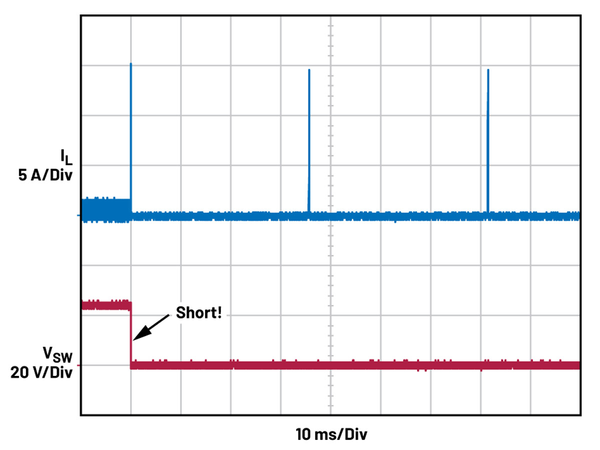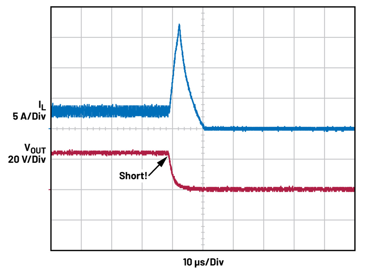 Omawiana przetwornica ma wbudowany mechanizm zabezpieczający przed zwarciem wyjścia. Zapobiega on uszkodzeniom w przypadku zwarcia wyjścia. Zewnętrzny rezystor pomiarowy i tranzystor FET z kanałem N połączone szeregowo z wejściem przetwornicy monitorują prąd i w razie potrzeby odłączają wejście. Gdy prąd przepływający przez rezystor pomiarowy wzrośnie na tyle, że osiągnie próg napięcia wewnętrznego komparatora, pin GATE zostaje dołączony do masy, wyłączając zewnętrzny tranzystor FET i ograniczając prąd zwarciowy cewki. Typową reakcję układu na zwarcie wyjścia przedstawiono na rysunkach 5 i 6.