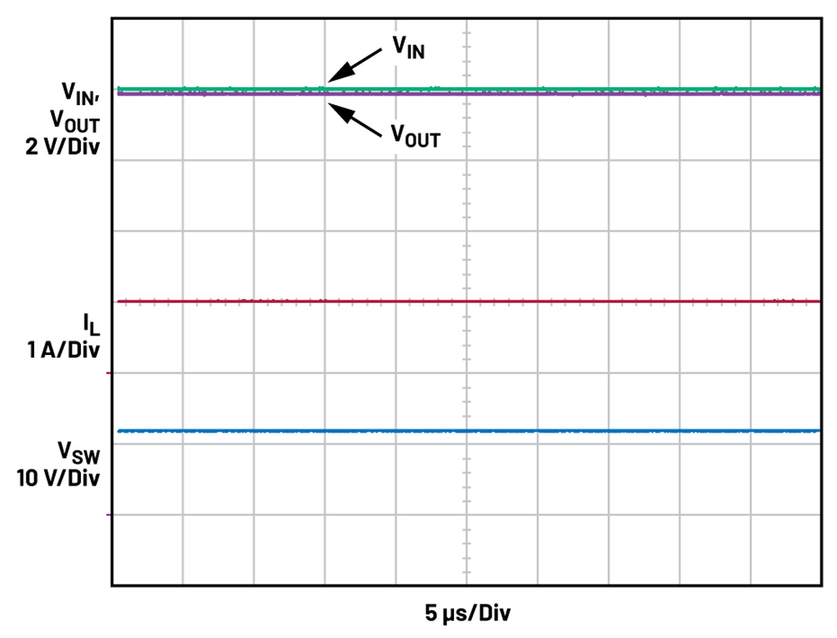 LT8342 to doskonały wybór do zastosowań samochodowych z preboostem, w których napięcie wejściowe przetwornicy boost jest zazwyczaj wyższe od regulowanego napięcia wyjściowego. Gdy wystąpi taka sytuacja, układ przechodzi w tryb PassThru. Górny wewnętrzny synchroniczny przełącznik zasilania pozostaje włączony przy 100% współczynniku wypełnienia, natomiast dolny przełącznik pozostaje wyłączony, tworząc bezpośrednią ścieżkę od wejścia do wyjścia. Układ przechodzi również w stan niskiego prądu spoczynkowego. Gdy zabezpieczenie przeciwzwarciowe nie jest włączone prąd ten jest równy 12 μA, a gdy zewnętrzny tranzystor FET odłącza wejście prąd jest równy 26,5 μA. Na rysunku 7 przedstawiono zastosowanie preboostu do zatrzymywania i rozruchu oraz zimnego rozruchu, a na rys. 8 zilustrowano jego działanie, gdy aktywny jest tryb PassThru.