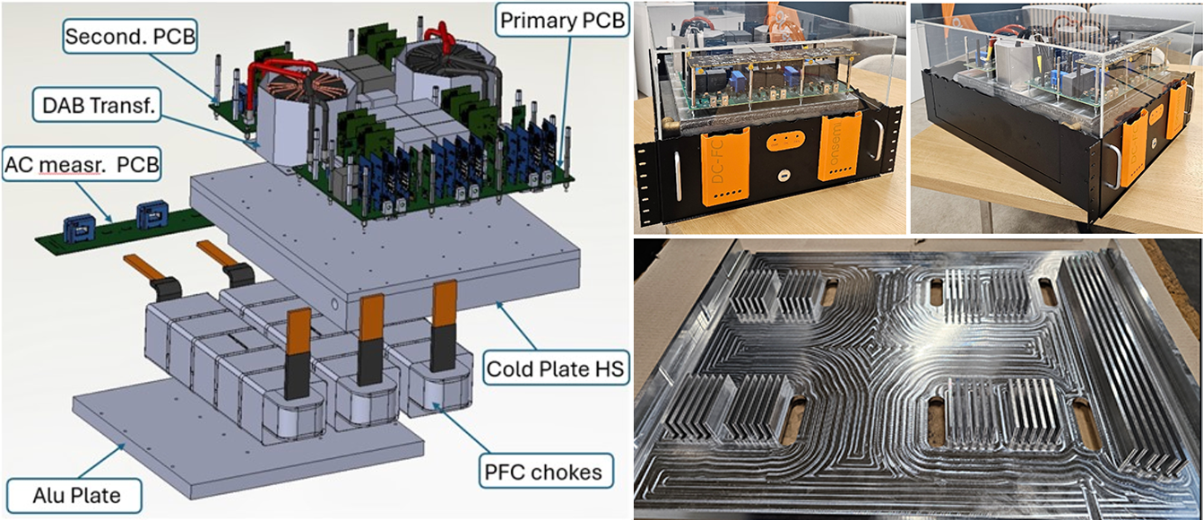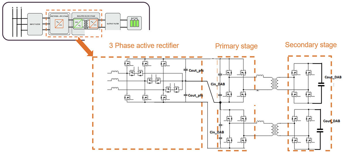 W tej konstrukcji zastosowano wysokowydajne tranzystory MOSFET z węglika krzemu (SiC), osiągając wydajność 97%. Działają one przy nominalnym napięciu wejściowym 480 V AC, generując magistralę wysokiego napięcia DC o wartości typowo około 1200 V. Kolejny stopień DAB (Dual Active Bridge) zapewnia izolację galwaniczną i przekształca magistralę wysokiego napięcia DC na programowalny zakres napięcia wyjściowego od 200 V do 1500 V. Ta szeroka elastyczność napięcia wyjściowego zapewnia kompatybilność z szeroką gamą systemów akumulatorowych, w tym z dzisiejszymi konfiguracjami 400 V i 800 V, a także z akumulatorami nowej generacji o napięciu 1200 V, stosowanymi w pojazdach użytkowych i elektrycznych ciężarówkach.
