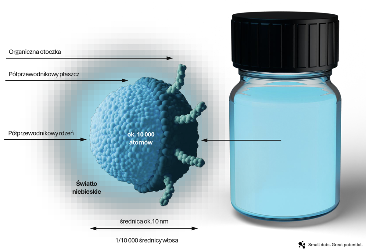 Półprzewodnikowe niebieskie kropki kwantowe. Slajd z prezentacji QNA Technology