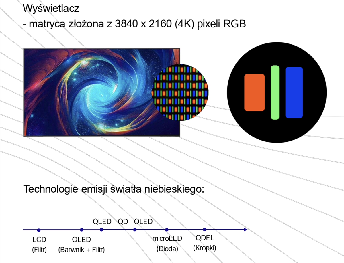 Emitery światła niebieskiego są najtrudniejsze do wykonania w każdej technologii. Slajd z prezentacji QNA Technology