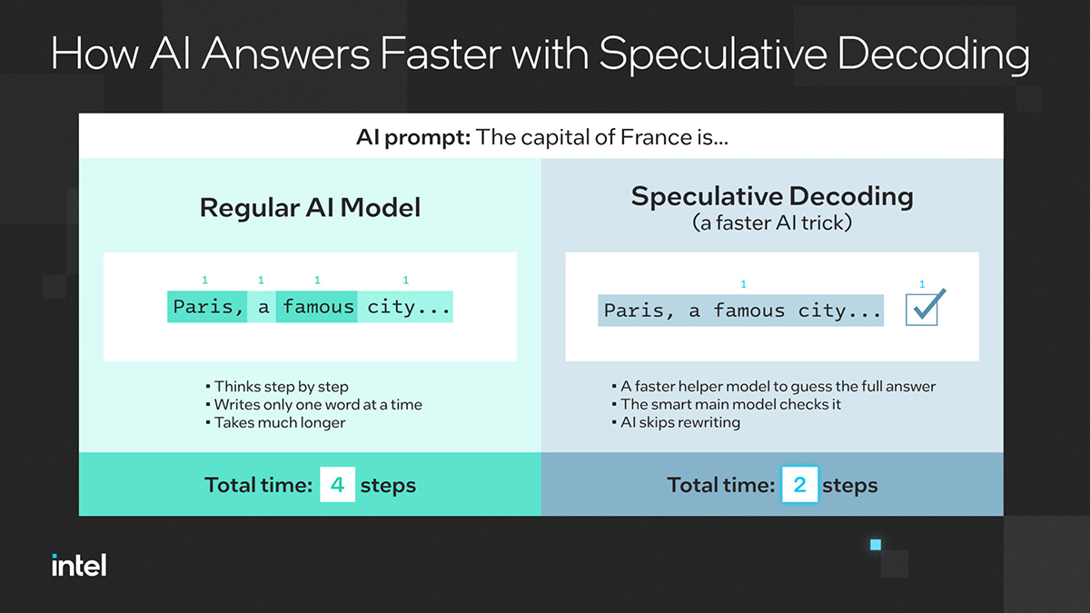 Naukowcy rozważali pytanie dla modelu AI: „Jaka jest stolica Francji…”. Tradycyjny LLM generuje każde słowo krok po kroku. Najpierw „Paryż”, potem „słynne”, potem „miasto” i tak dalej, zużywając znaczne zasoby na każdym kroku. Dzięki dekodowaniu spekulatywnemu mały model asystenta szybko tworzy pełną frazę „Paryż, słynne miasto…”. Następnie duży model weryfikuje sekwencję. To znacznie zmniejsza liczbę cykli obliczeniowych na token wyjściowy.