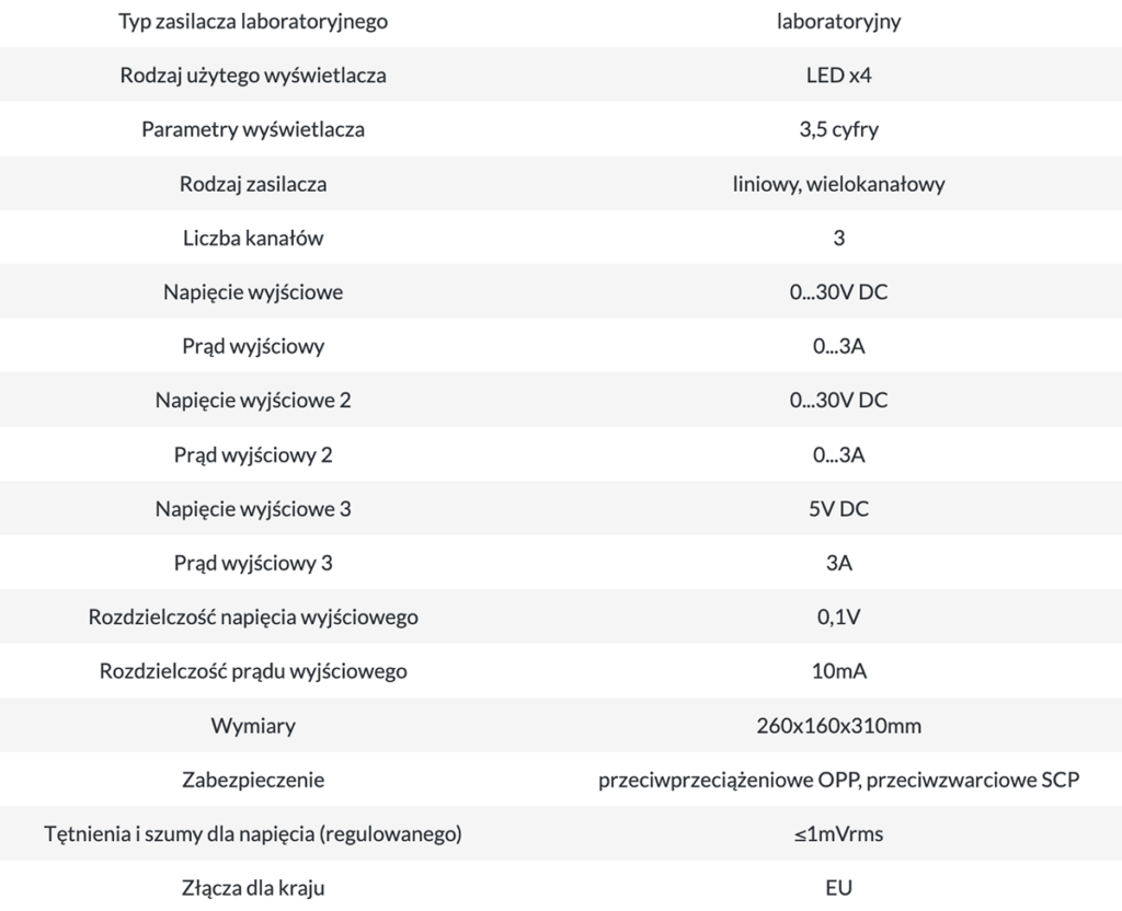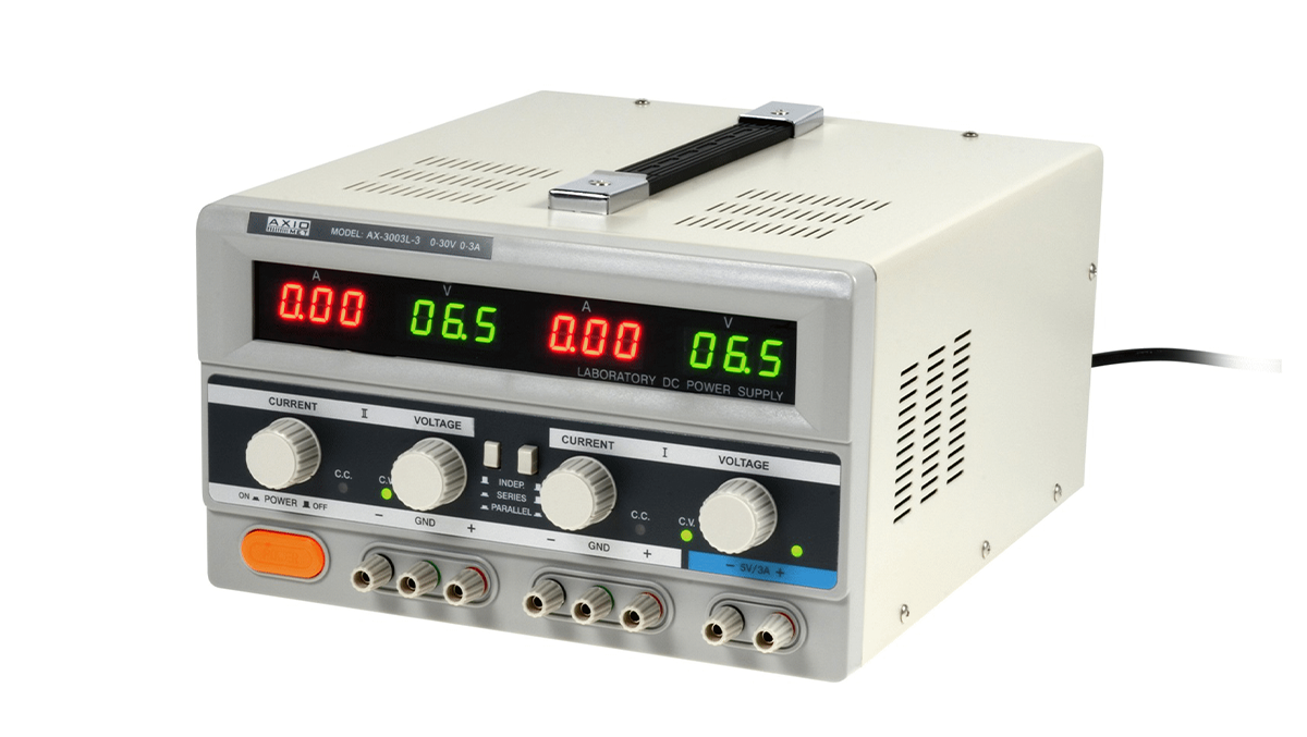 Model AX-3003L-3 to liniowy zasilacz prądu stałego marki Axiomet. Jego dwa główne kanały mogą dostarczać napięcie wyjściowe z zakresu 0 V…30 V DC przy prądzie do 3 A. Trzeci kanał jest nieregulowany, udostępnia napięcie stałe 5 V przy wydajności prądowej 3A, czyli posiada typowe parametry interfejsu USB i układów TTL. Zasilacz odznacza się możliwością pracy w trybie stabilizacji prądowej lub napięciowej. Jego zaletą jest niski poziom tętnień i szumów: ≤1 mVRMS. Wbudowana ochrona przed przeciążeniem (OPP) i zwarciem (SCP) zapewnia wysokie bezpieczeństwo pracy.