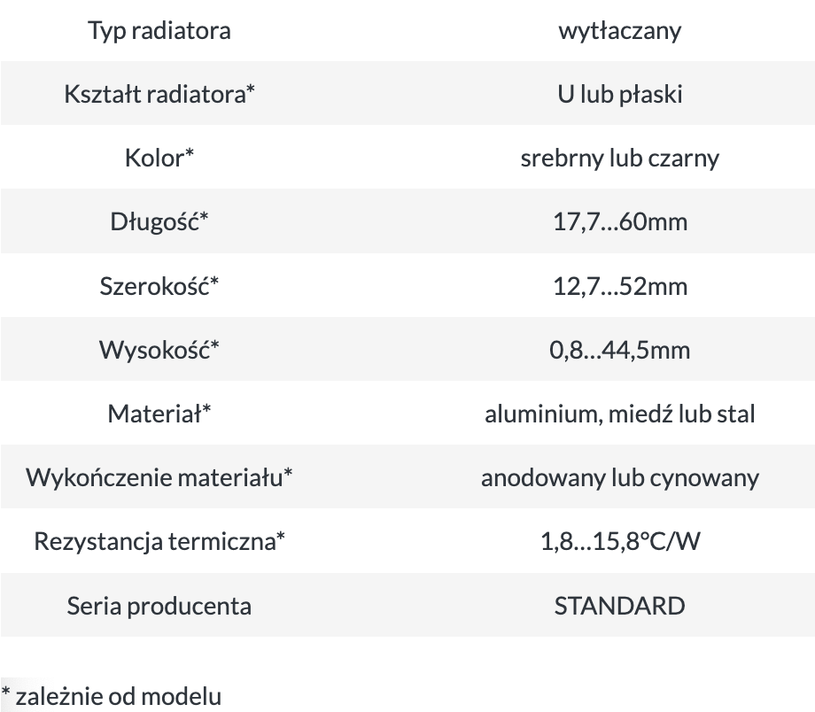 Zastosowanie radiatorów jest konieczne przede wszystkim do odprowadzania ciepła z komponentów dużej mocy – pozwala im też zachować nominalne parametry i minimalizuje spadek sprawności powodowany wzrostem temperatury. Obudowy TO są fabrycznie przystosowane do instalacji radiatora (zazwyczaj wyposażone w otwór na śrubę) i umieszcza się w nich elementy oraz układy wydzielające znaczne ilości ciepła: diody prostownicze, wzmacniacze, stabilizatory liniowe oraz tranzystory MOSFET, IGBT i BJT. Z szerokiej oferty ATS można wybrać radiatory przystosowane do każdej typowej aplikacji.