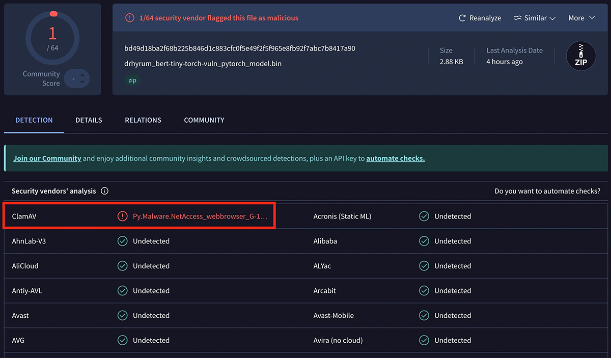 - Jedyny silnik antywirusowy skoncentrowany na AI w VirusTotal – ClamAV jako jedyne narzędzie wykrywa złośliwe modele zarówno na Hugging Face, jak i w platformie VirusTotal, która analizuje przesyłane pliki pod kątem zagrożeń.