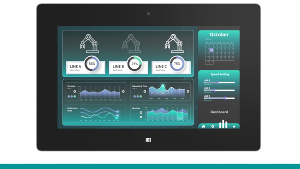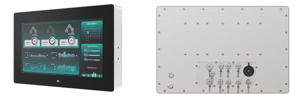 Komputer przemysłowy wyposażono w ekran 18,5″ Full HD (1920×1080) o jasności 500 cd/m² i kontraście 1000:1. Panel dotykowy PCAP obsługuje multitouch do 10 punktów, działa w rękawiczkach i w wilgotnym otoczeniu. Powłoka o twardości 7H chroni przed zarysowaniami, a warstwa antyodblaskowa i anty-UV ułatwia pracę w wymagających warunkach oświetleniowych.