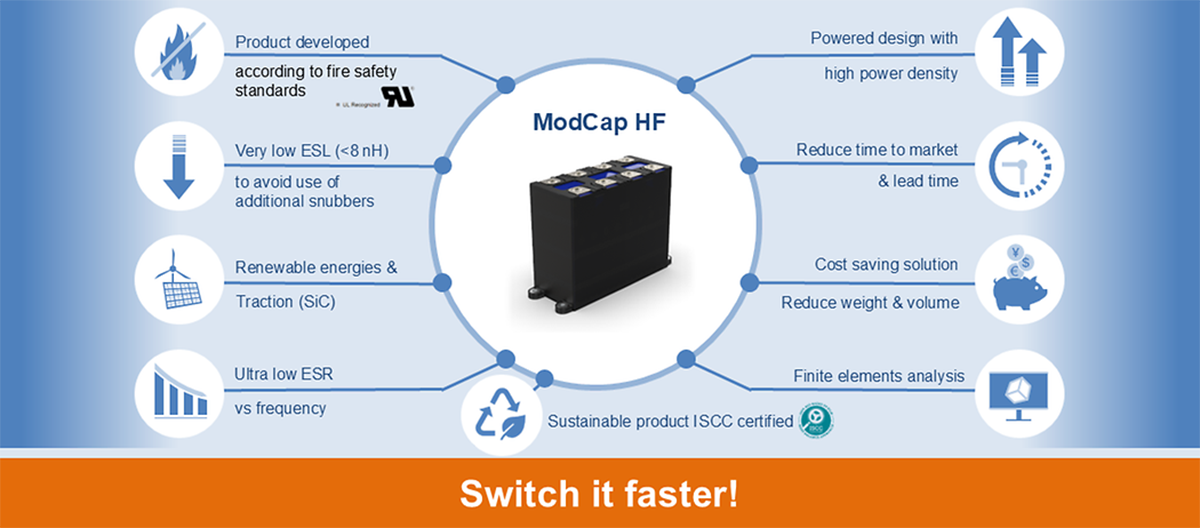 • Wydajność przy wysokich częstotliwościach: Kondensatory ModCap HF są zoptymalizowane do pracy przy wysokich częstotliwościach, dzięki czemu dobrze nadają się do nowej generacji przetworników wykorzystujących półprzewodniki mocy oparte na SiC lub najnowszej generacji IGBT.