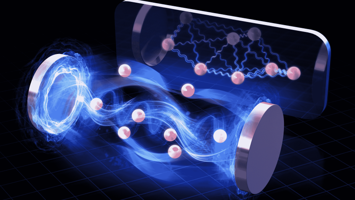 Wizualizacja atomów we wnęce optycznej oddziałujących ze sobą oraz jednocześnie ze światłem. Źródło: WFUW za Yao Wang; Emory University