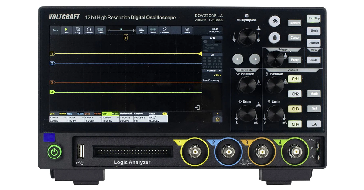 Najwyższy model z nowej serii oscyloskopów Voltcraft: DOV 2504F LA z czterema wejściami analogowymi, pasmem 250 MHz, generatorem funkcyjnym i 16 kanałami. Źródło: Conrad Electronic