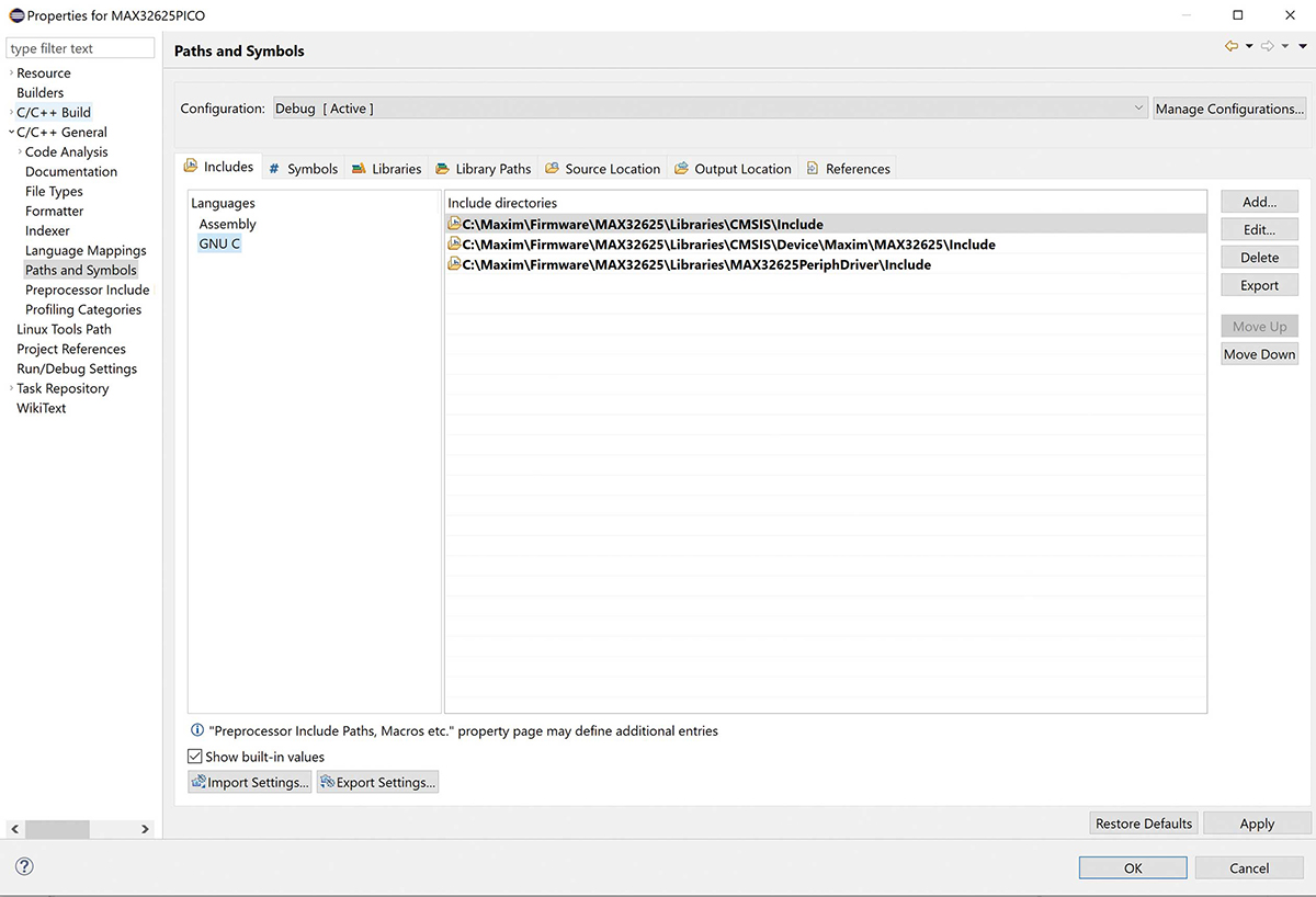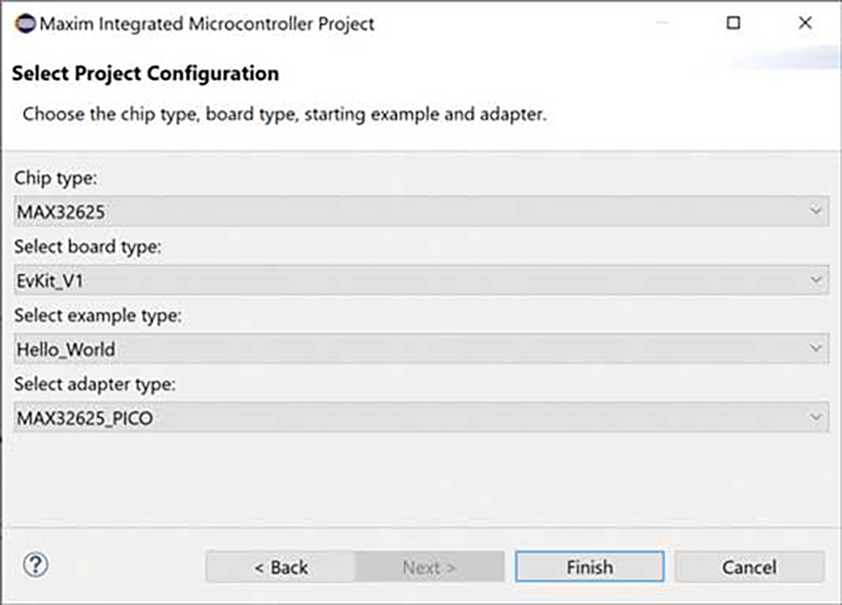 Począwszy od serca MAX32625 (rdzenia Arm) i kierując się na zewnątrz, istnieje zestaw plików do konfiguracji samego rdzenia Arm, następnie zestaw plików do konfiguracji urządzeń peryferyjnych otaczających rdzeń Arm, a na końcu zestaw do konfiguracji komponentów zestawu ewaluacyjnego otaczających procesor. Eclipse musi zostać skonfigurowane, aby mogło znaleźć te pliki podczas kompilacji programu.