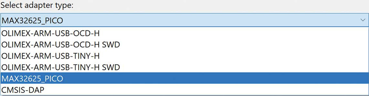 Ponieważ zamiast debuggera JTAG używany jest programator PICO, w sekcji Select adapter type wybierz MAX32625_PICO. Patrz rysunek 4: