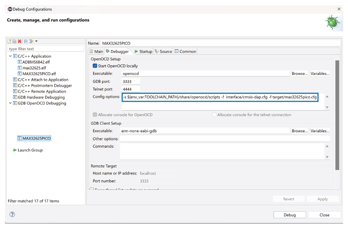W zakładce Debugger zmień plik CFG z MAX32625.cfg na MAX32625pico.cfg, jak pokazano na rysunku 5: