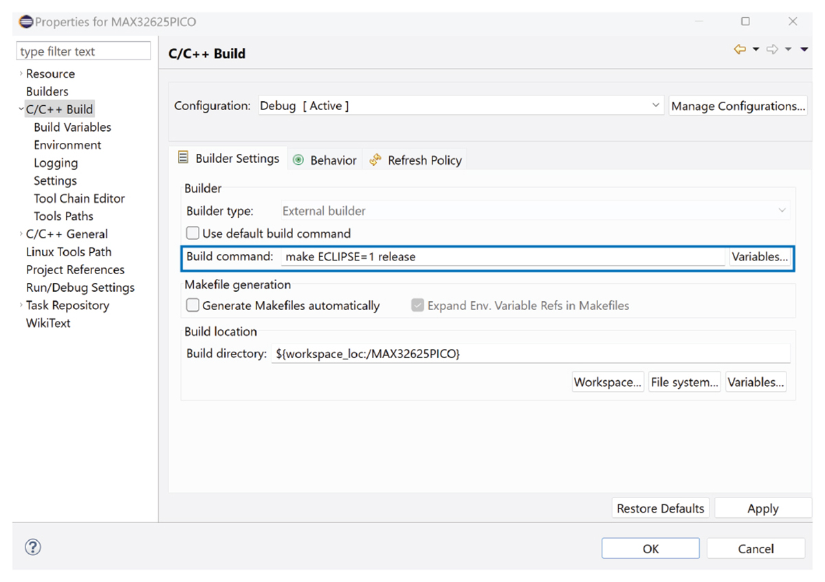 W oknie Project Explorer ponownie kliknij prawym przyciskiem myszy nazwę projektu i wybierz opcję Properties. Kliknij lewym przyciskiem myszy nagłówek C/C++ Bulid i w zakładce Bulider Settings upewnij się, że polecenie kompilacji brzmi: