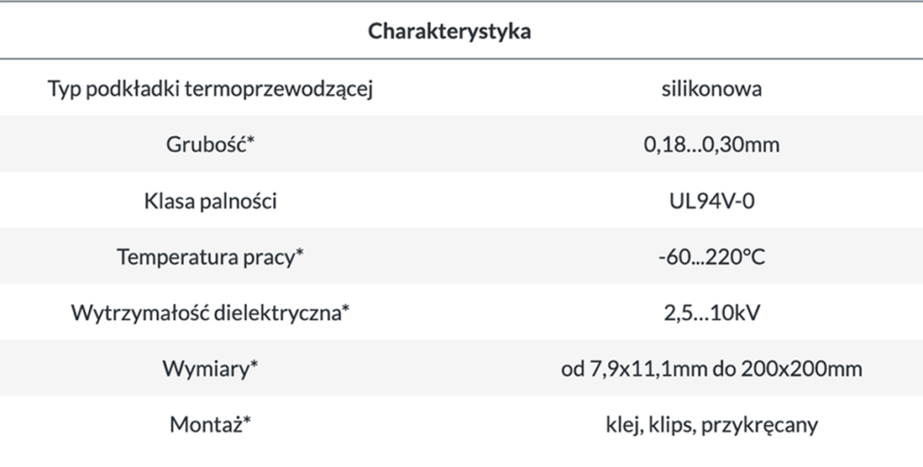 Podkładki termoprzewodzące zostały wykonane z silikonu charakteryzującego się szerokim zakresem temperatur pracy (od -60°C do 220°C) oraz przewodnością cieplną na poziomie 0,9W/m·K. Elementy te zapewniają izolację elektryczną dzięki wytrzymałości dielektrycznej od 2,5kV do 10kV.