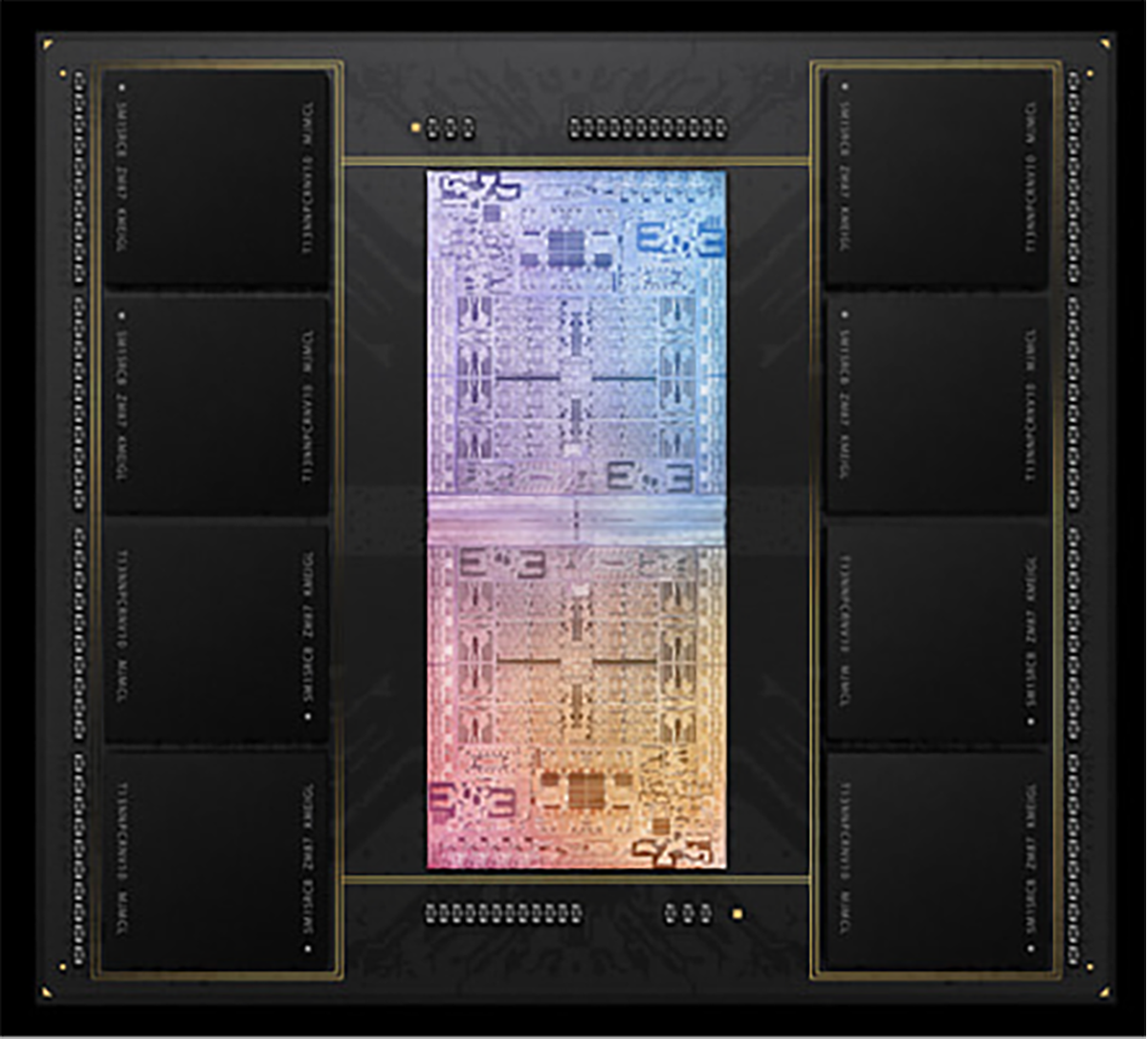 Rysunek powyżej odpowiada na pytanie, kiedy stosować chiplety. Jedna z takich sytuacji jest pokazana na rysunku dotyczącym montażu 2.5D, podobna sytuacja – przy zachowaniu tych samych kolorów – pokazana jest na rysunku montażu 3D. Układ RF, np. telekomunikacyjny, wymaga innej technologii niż układ logiki np. procesora. To samo dotyczy pamięci i czujnika MEMS. Wszystkie te układy, aby uzyskać najlepsze parametry, powinny być wykonane w specyficznych i optymalnych dla nich technologiach. Tego nie moglibyśmy uzyskać stosując jeden monolityczny układ scalony. Inna sytuacja jest wówczas, gdy z przyczyn technologicznych i kosztów wytwarzania, lepiej jest wykonać układ scalony jako chiplet. Przykładem jest procesor firmy Apple M1 Ultra ( zdjęcie poniżej) , który składa się z dwóch takich samych układów scalonych M1 Max.