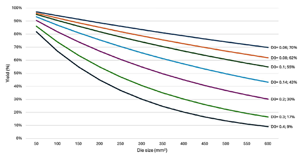 Wraz ze wzrostem powierzchni chipu, uzysk układów scalonych monolitycznych spada (D0 = gęstość defektów). Źródło: IC-Link by imec