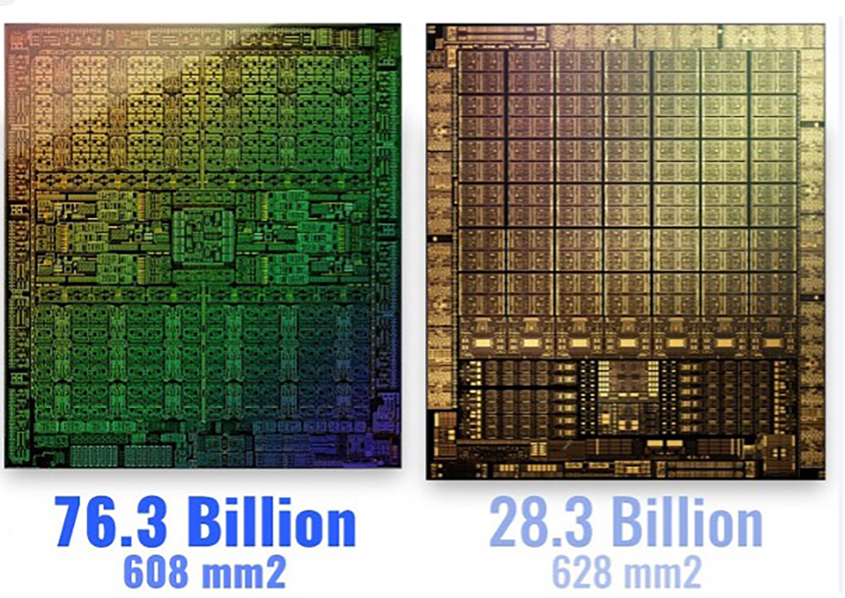 Zdjęcia chipów procesorów dla kart graficznych. Z lewej: RTX4000; z prawej: RTX3060