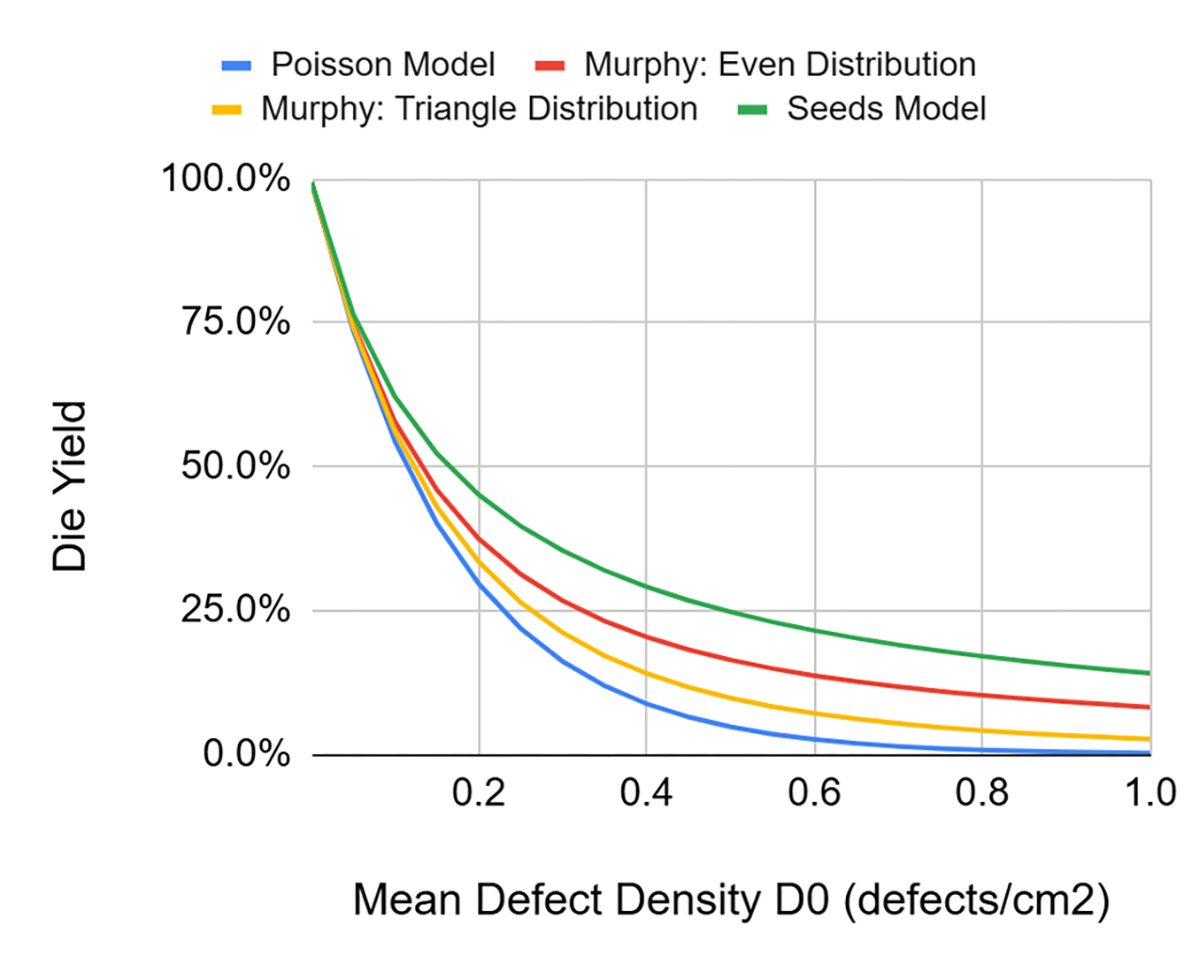 Modele statystyczne pokazują, jak zmienia się uzysk wraz ze wzrostem powierzchni układu scalonego (rys. poniżej ). „D0” to liczba defektów i przyjmuje się, że wynosi on 0.4 defektu/cm2 dla dobrze opanowanej technologii. Wiodące firmy produkujące układy scalone podają, że w ich fabrykach D0 = 0.1 defektu/cm2. Przy D0 = 0.1 defektu/cm2 dla maksymalnej powierzchni chipu 8.58 cm2, uzysk wynosi ponad 42%. Dane są podane dla tzw. rozkładu/modelu Poisson’a. Zakłada się, że model ten jest dobry dla relatywnie małych chipów i prostszych technologii. Dla określenia uzysków dla większych i bardziej zaawansowanych chipów zbudowano inne modele np. model Seeds’a.