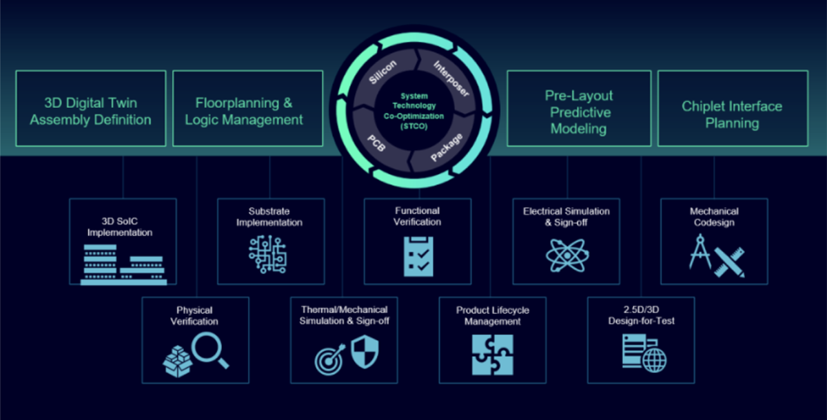 Oprogramowanie Innovator3D IC – widok zintegrowanego kokpitu dla projektanta chipletu w tym z wykorzystaniem montażu 3D. Źródło: materiały firmy Siemens EDA