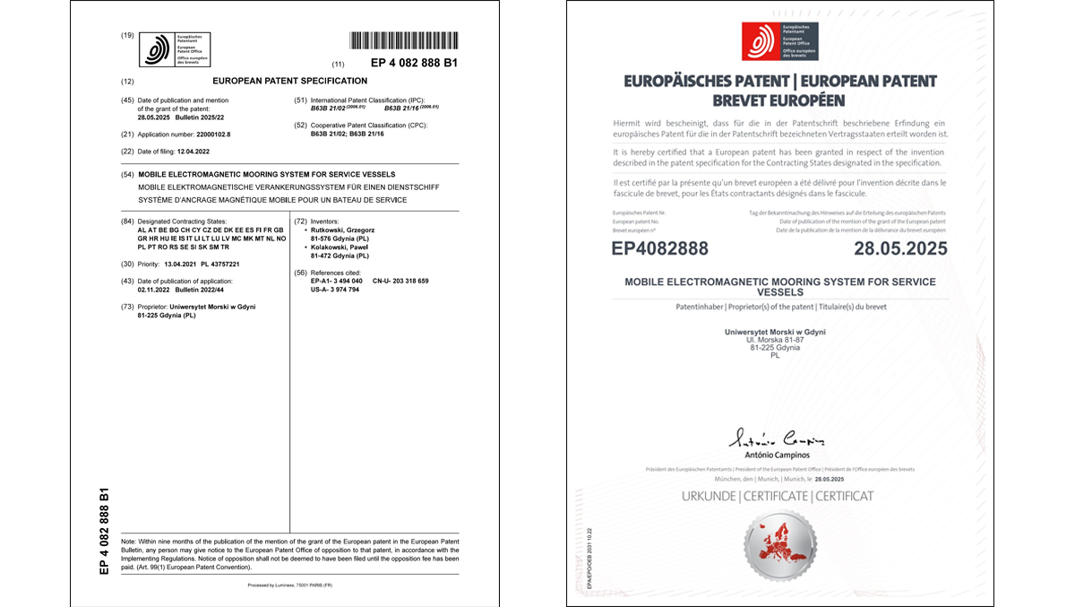 Europejski Urząd Patentowy (EOP) zatwierdził zgłoszenie Uniwersytetu Morskiego w Gdyni dotyczące innowacyjnego systemu „Mobile electromagnetic mooring system for surface vessels”.